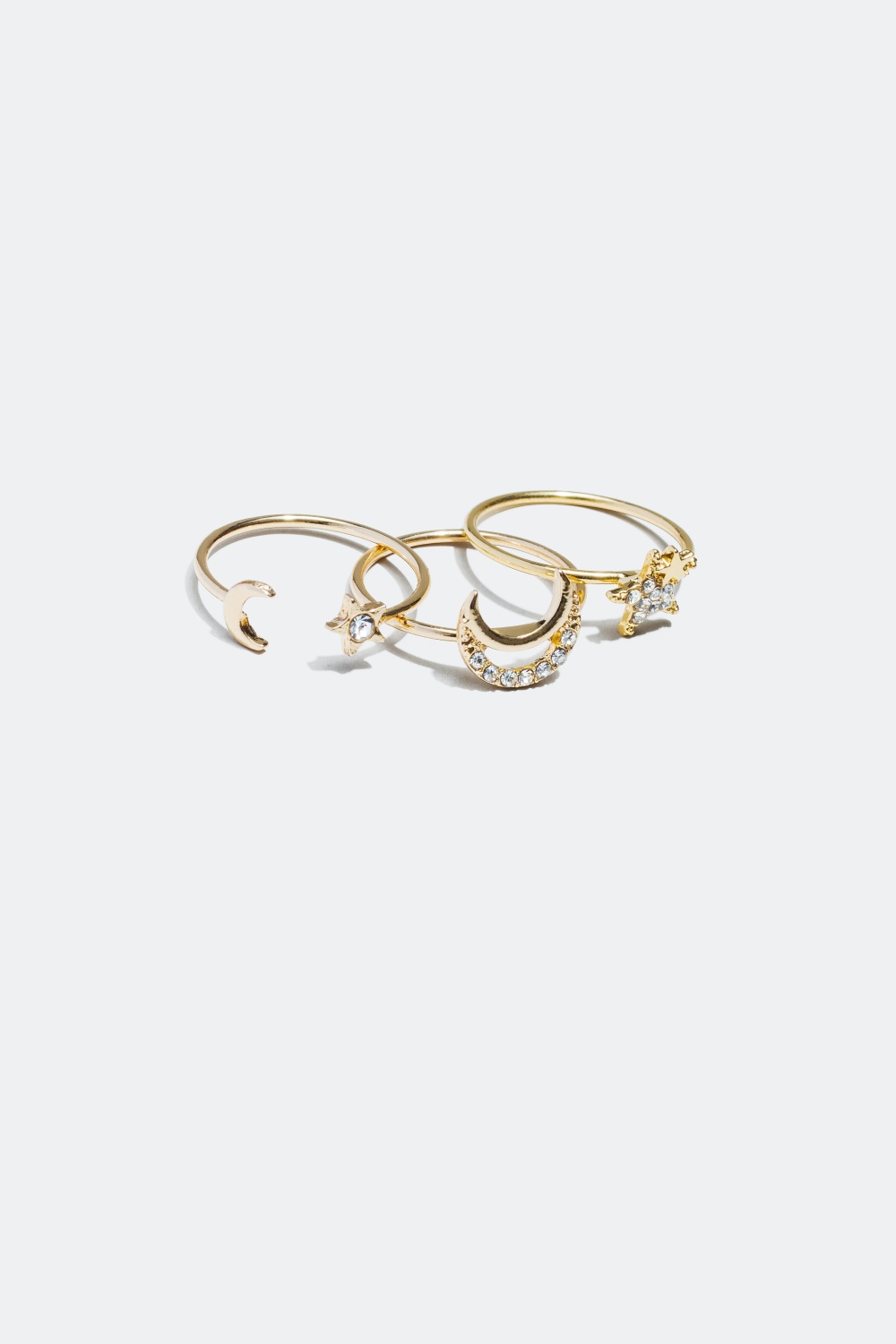 Trendy gullfargede ringer i 3-pakning med stjerner og måner, og kledd i hvite strassteiner.
