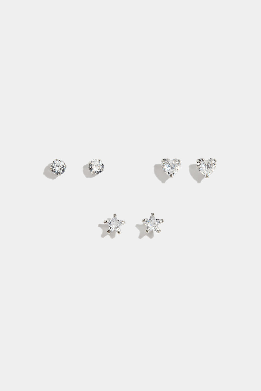 3-pakning studs i ekte sølv med steiner i Cubic Zirconia, utformet som hjerter, stjerner og klassiske runde steiner.