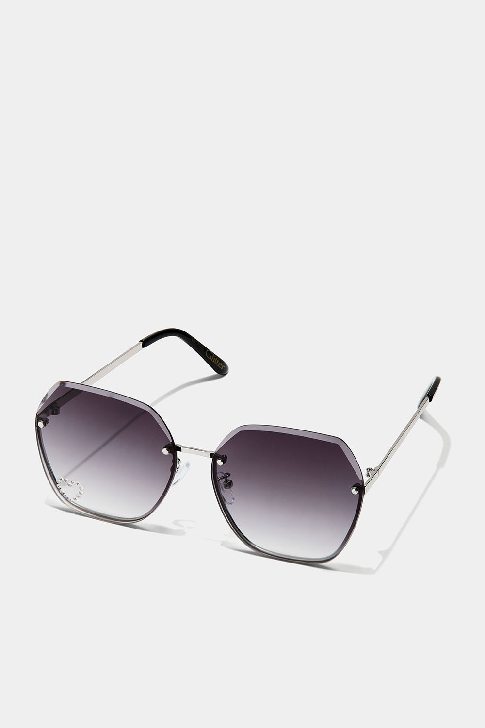 70-tallsinspirerte, overdimensjonerte solbriller med tonede glass og et dekorativt strasshjerte på glasset. Glasset har vinkelslipt kant øverst for ekstra retrofølelse.