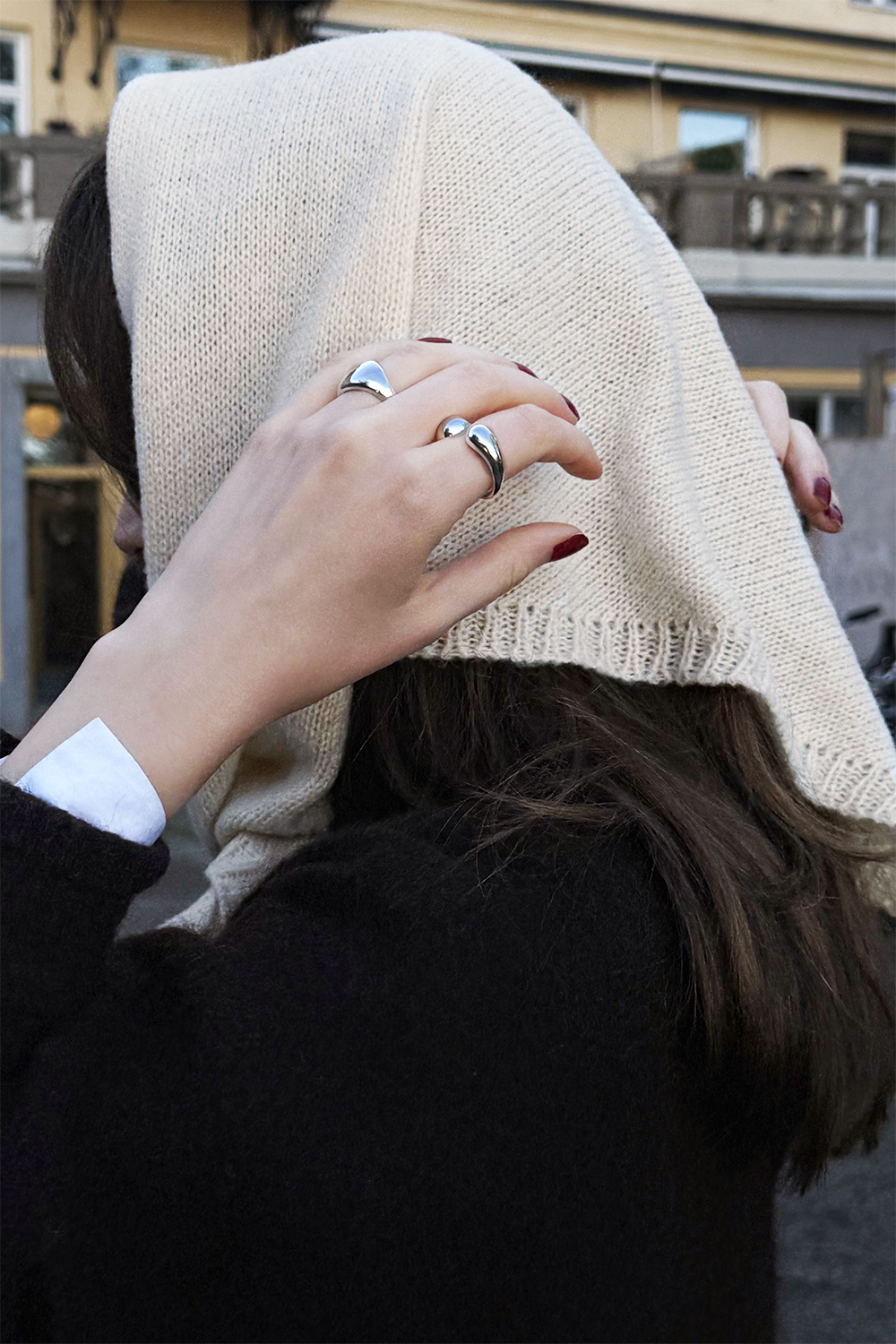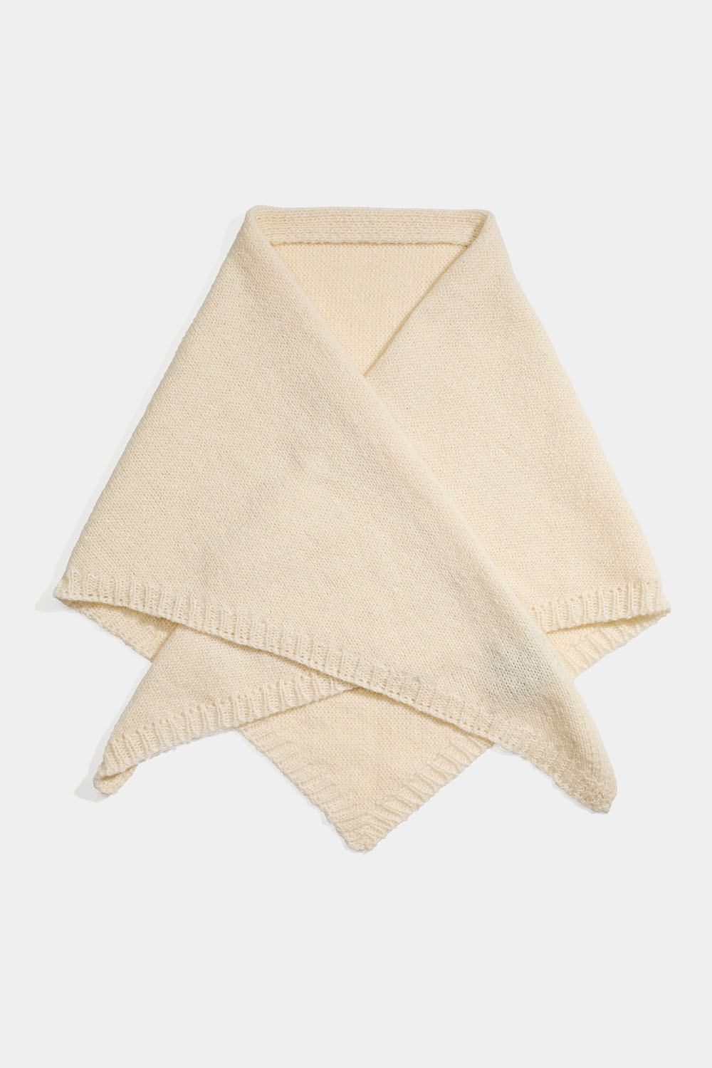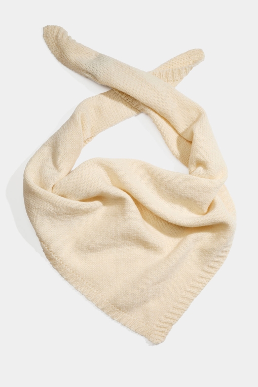 Off-white, strikket trekantet skjerf med ribbestrikkede kanter.