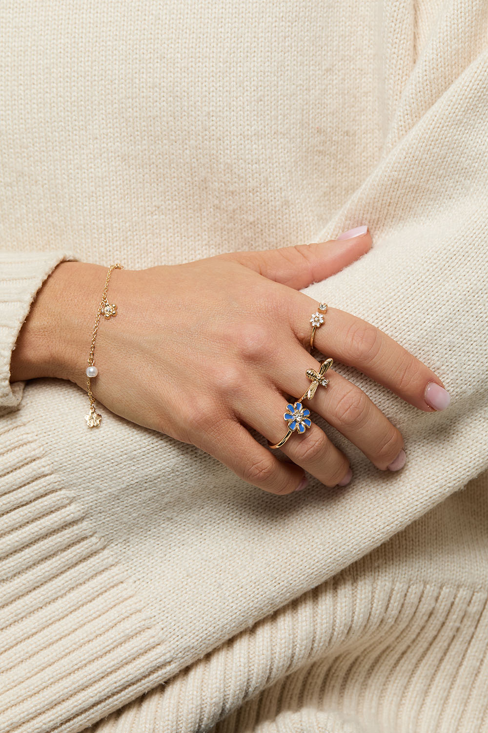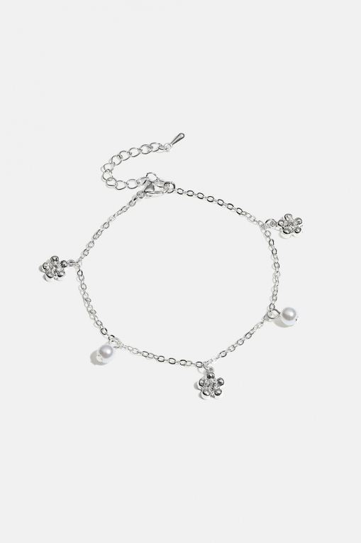 Kjedearmbånd i metall med små anheng med hvite perler og blomster i skinnende glassten.