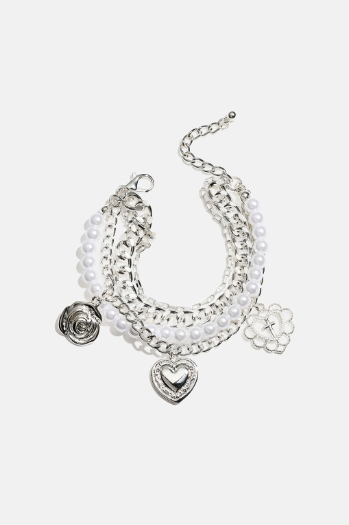 Armbånd med tre kjeder i forskjellige design og et perlekjede. Armbåndet har tre hengende anheng i form av hjerter og en rose.