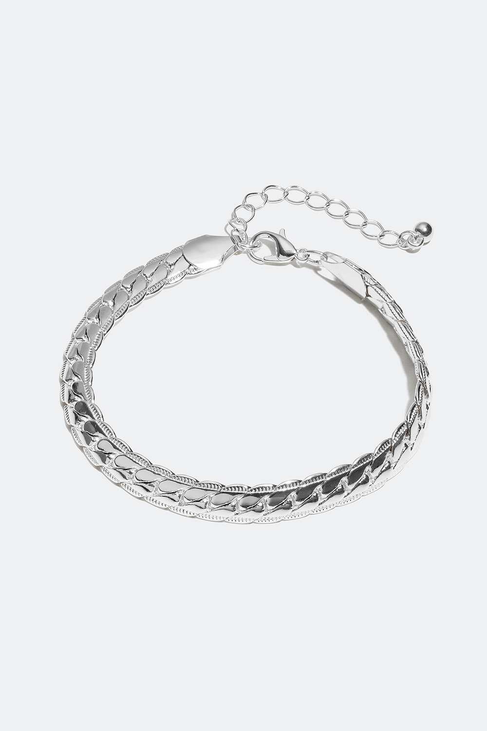 Kjedearmbånd i metall med tette og flate ledd og et mønster langs kantene. Et stilrent armbånd med et bredere design som fungerer perfekt i hverdagen. Til en festligere anledning kan det enkelt kombineres med andre armbånd.