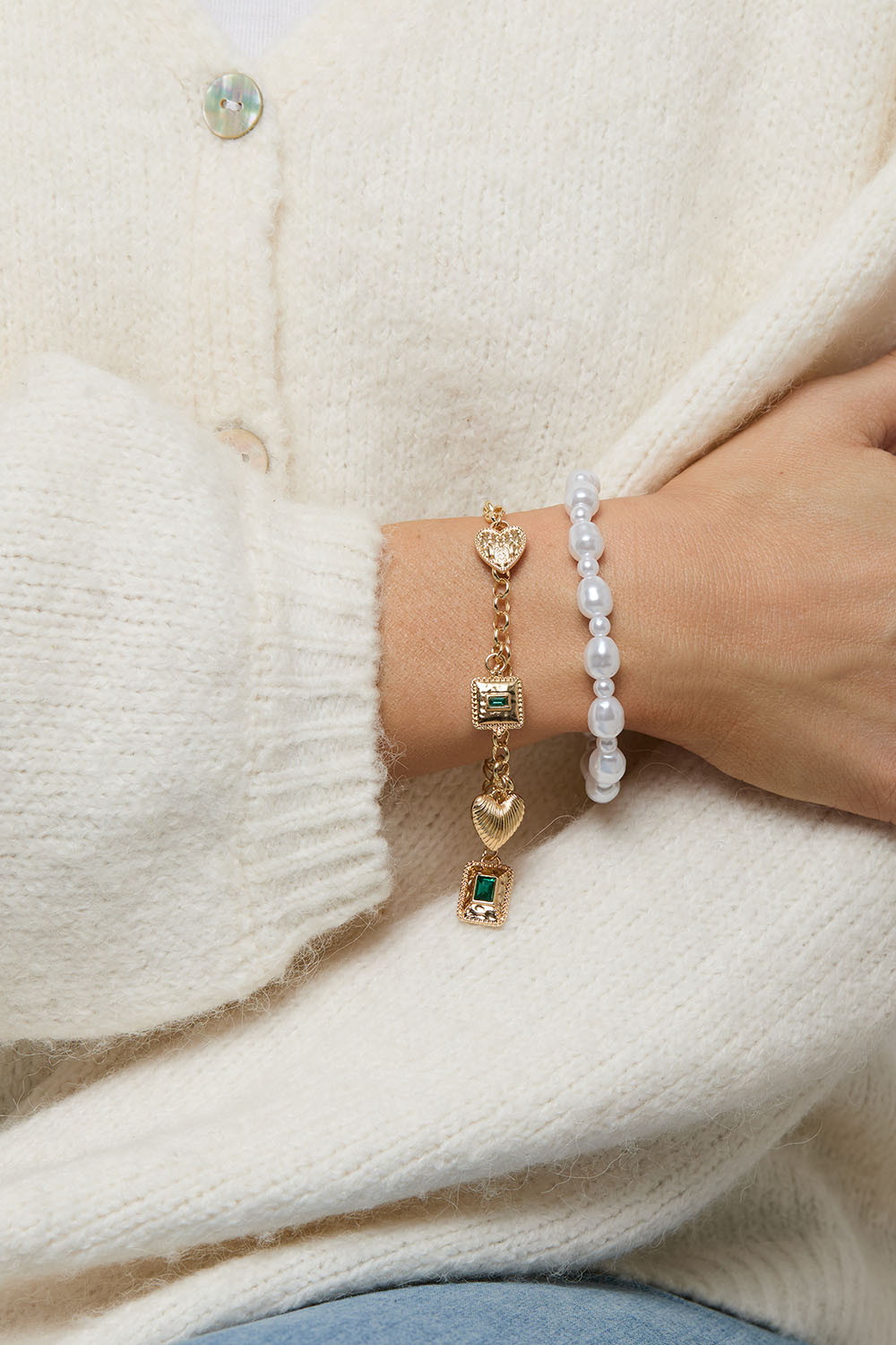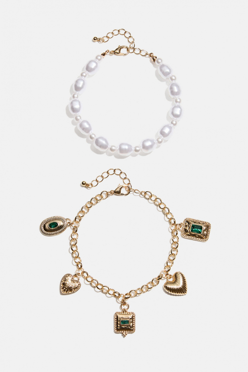 2-pakning med armbånd. Ett med hvite perler i forskjellige former, og et armbånd i gullfarget metall med forskjellige charms med grønne detaljer.