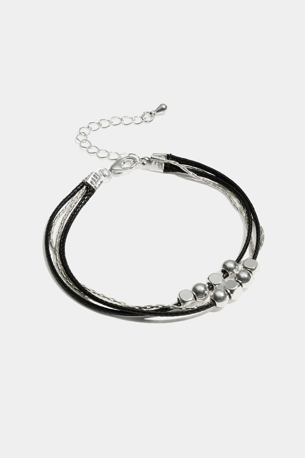 Armbånd med tynt kjede og svart tau, dekorert med åtte små sølvperler i forskjellige former.