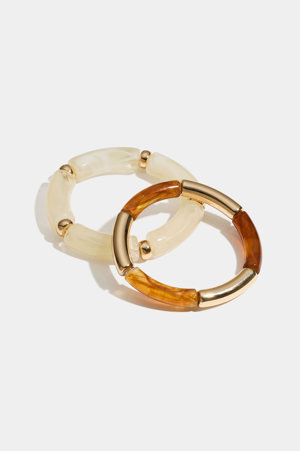 2-pakning armbånd der det ene har sylindriske ledd i brun ravimitasjon, kombinert med gullfargede ledd. Det andre armbåndet har beigeskiftende ledd og gullfargede detaljer. Begge er tredd på elastisk tråd.