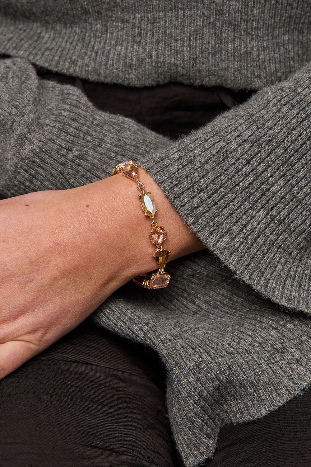 Armbånd i gullfarget metall med glassteiner i rosa, beige og brun i ulike former.