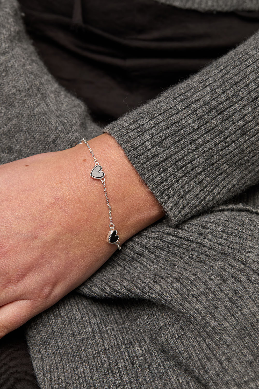 Armbånd med tynt kjede dekorert med sorte, skimrende hjerter Ved hjelp av en gummiert sølvperle kan lengden justeres.