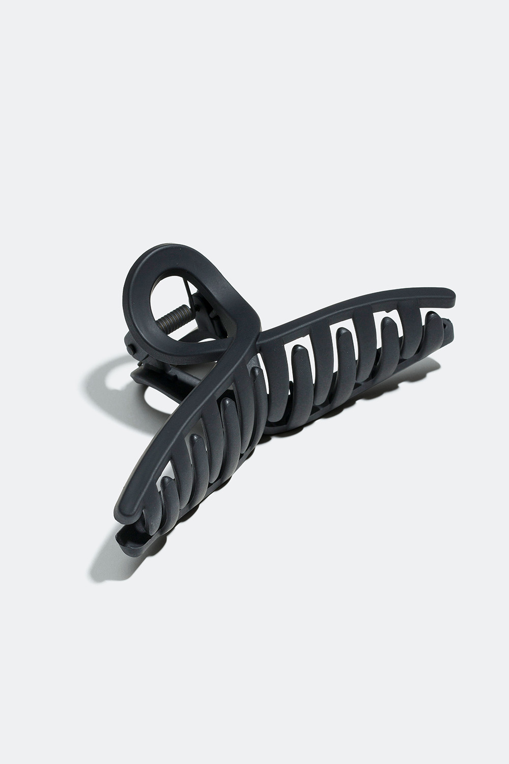 Svart, avlang hårklemme med en sløyfe som detalj, noe som gir den en fin profil. Hårklemmen har åtte tette pigger som er lengre inn mot midten og kortere ytterst.