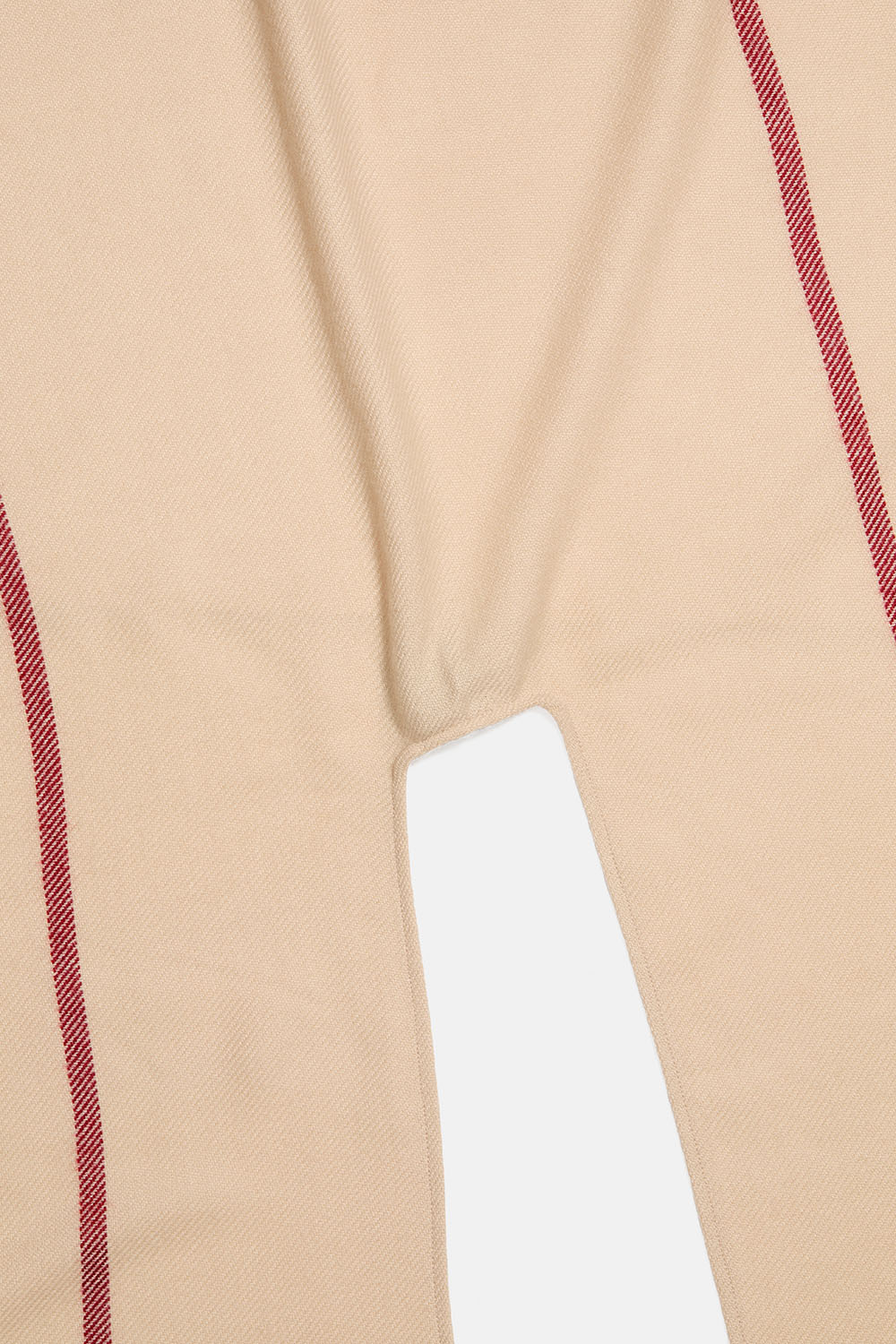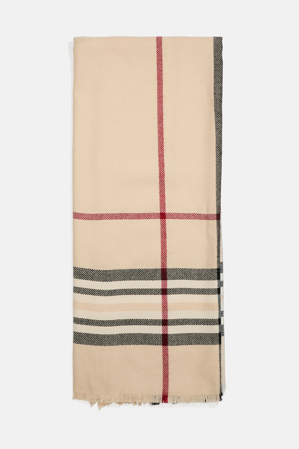 Beige poncho med frynser og rutete mønster i svart og rødt.