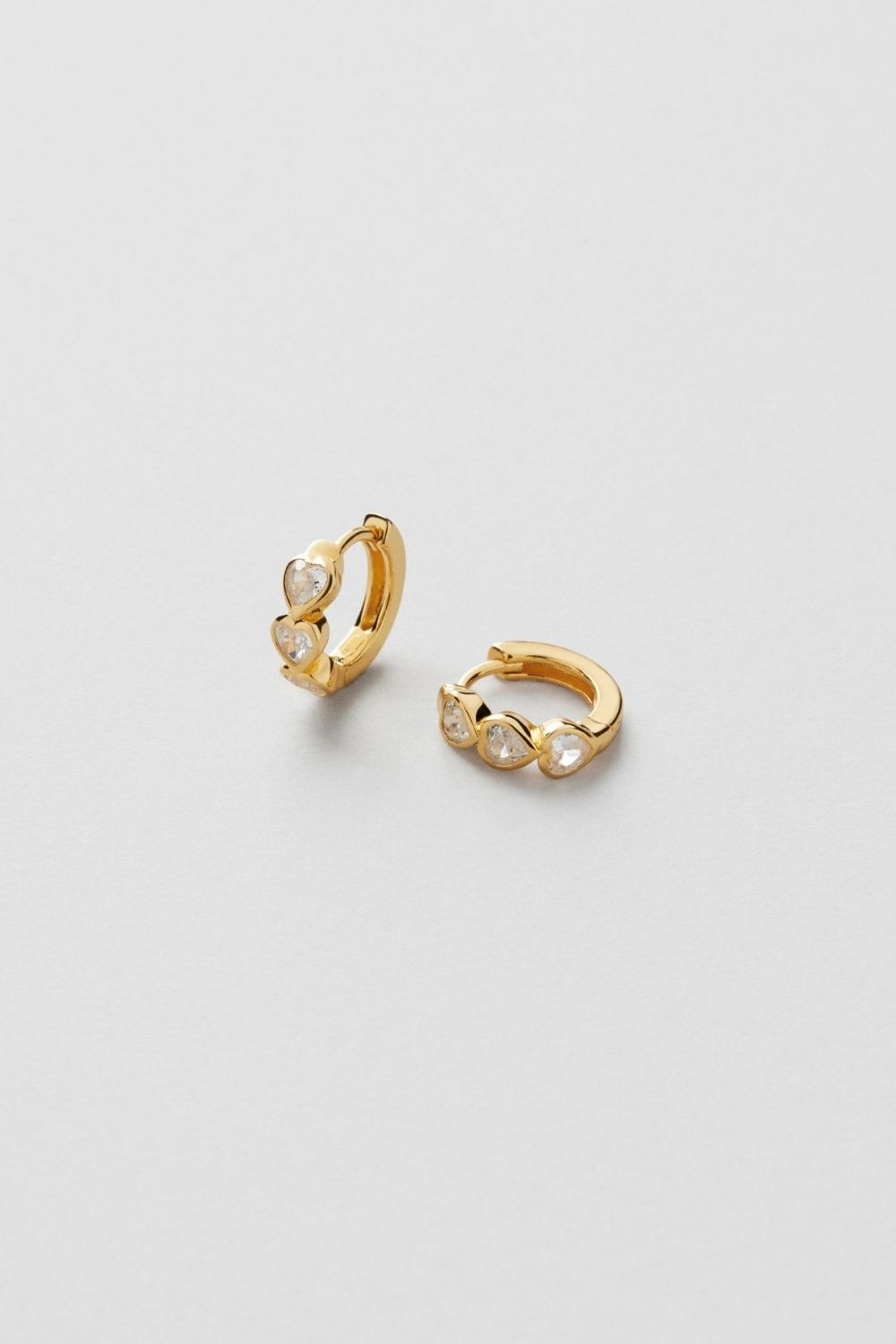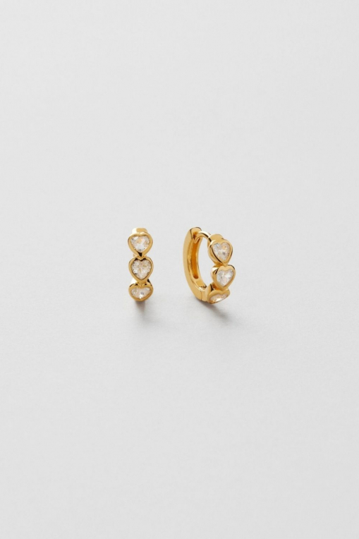 Huggie hoops-øredobber med hjerteformede, klare Cubic Zirconia-stener i bezelinnfatning, belagt med ekte 18k gull og med en kjerne av ekte sterlingsølv 925.