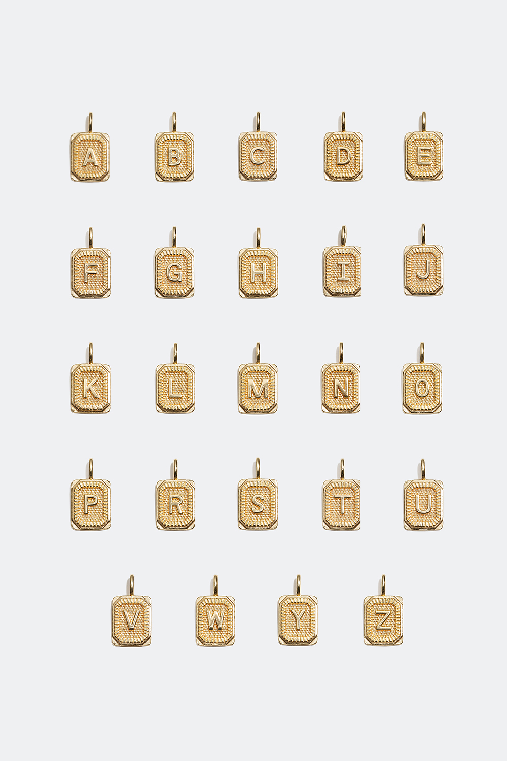 Bokstavanheng formet som en rektangulær brikke med strukturert og mønstret overflate. Anhenget er i ekte sølv som er forgylt med 18 K gull. Velg mellom flere forskjellige bokstaver og match med en halslenke. Kombiner gjerne flere av bokstavsmykkene våre og gjør smykket ditt mer personlig ved å skape navn, ord eller initialer. Et populært smykke som også er perfekt å gi som presang.