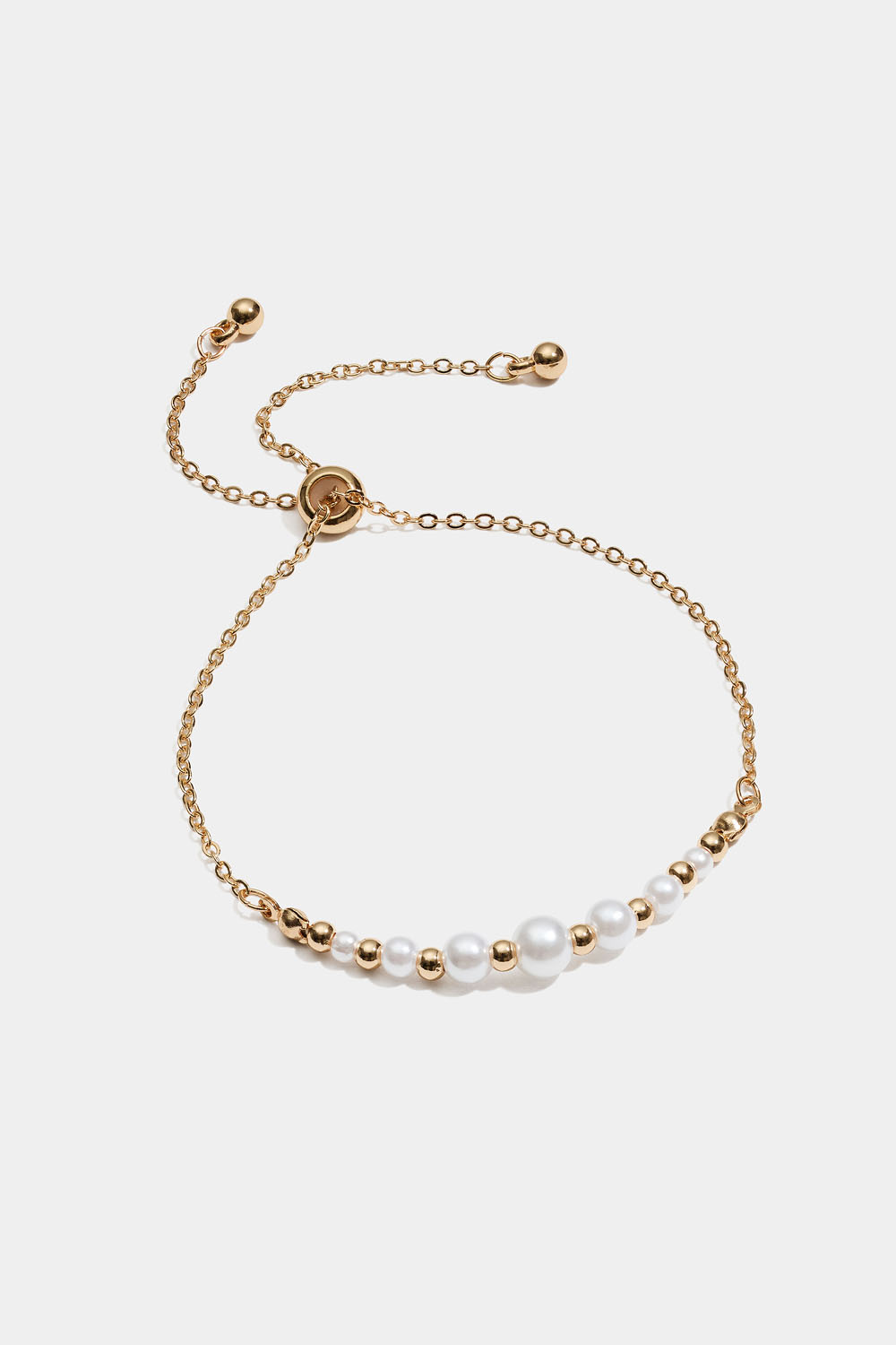 Armbånd med tynt kjede dekorert med hvite og gullfargede perler. Lengden er justerbar ved hjelp av en gummiert gullperle.