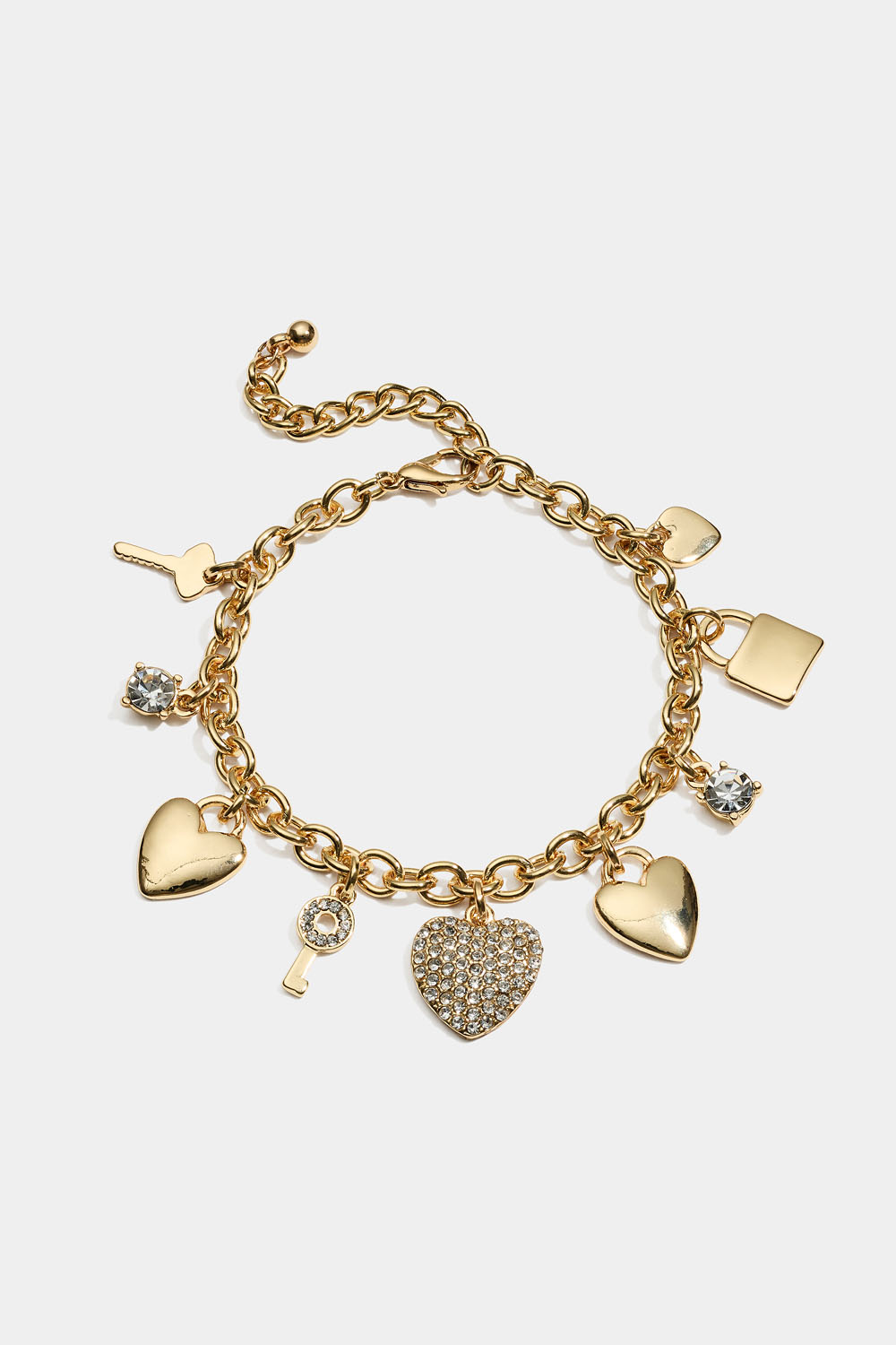 Kraftig, kjedet armbånd med hengende charms formet som hjerter og nøkler.