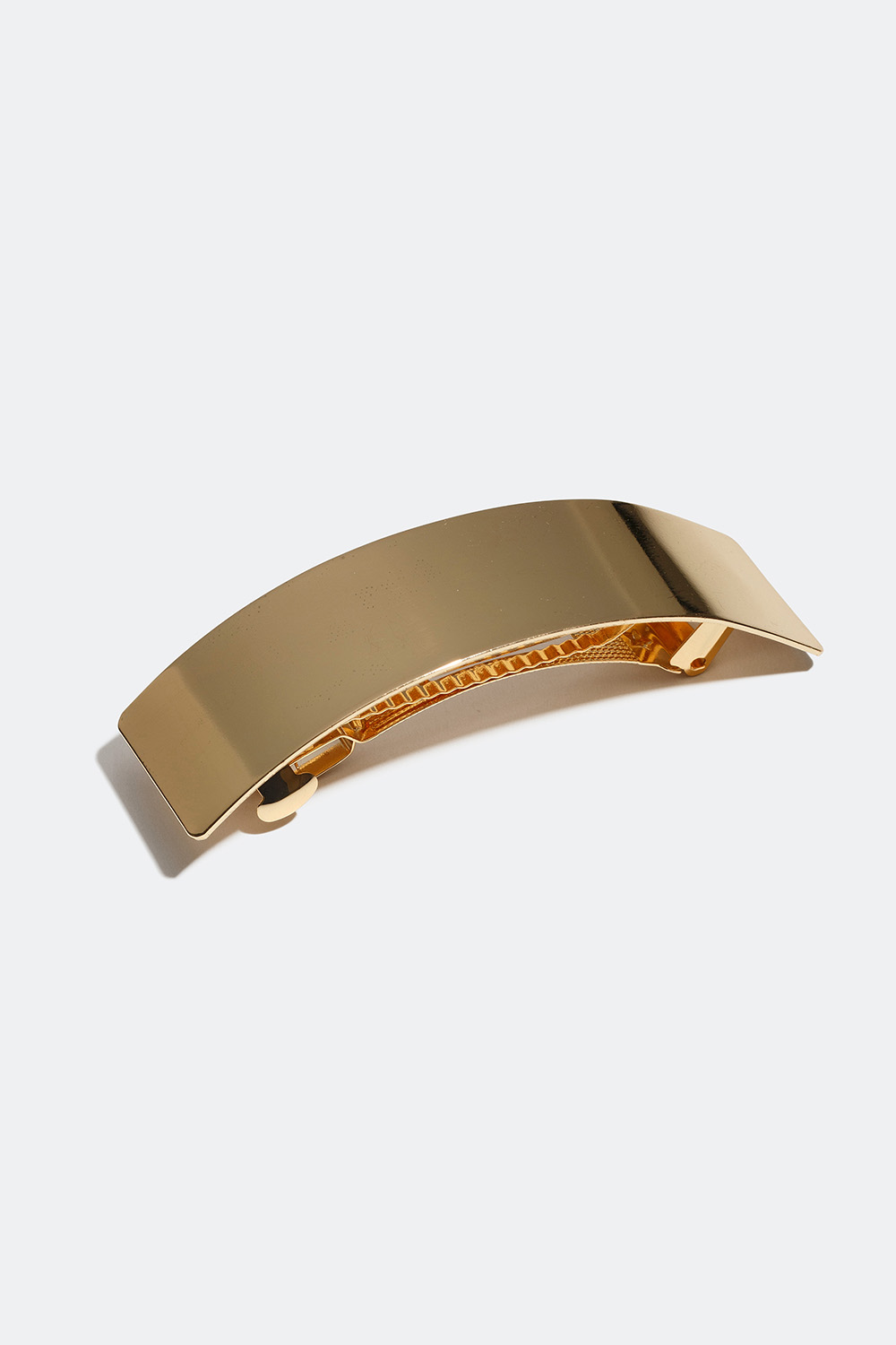 En bred hårspenne med en rektangulær, lett bøyd plate i blankt metall. Et enkelt og smidig hårtilbehør i stilren design som passer til alle anledninger. Fungerer perfekt for både halvt og helt oppsatt hår.
