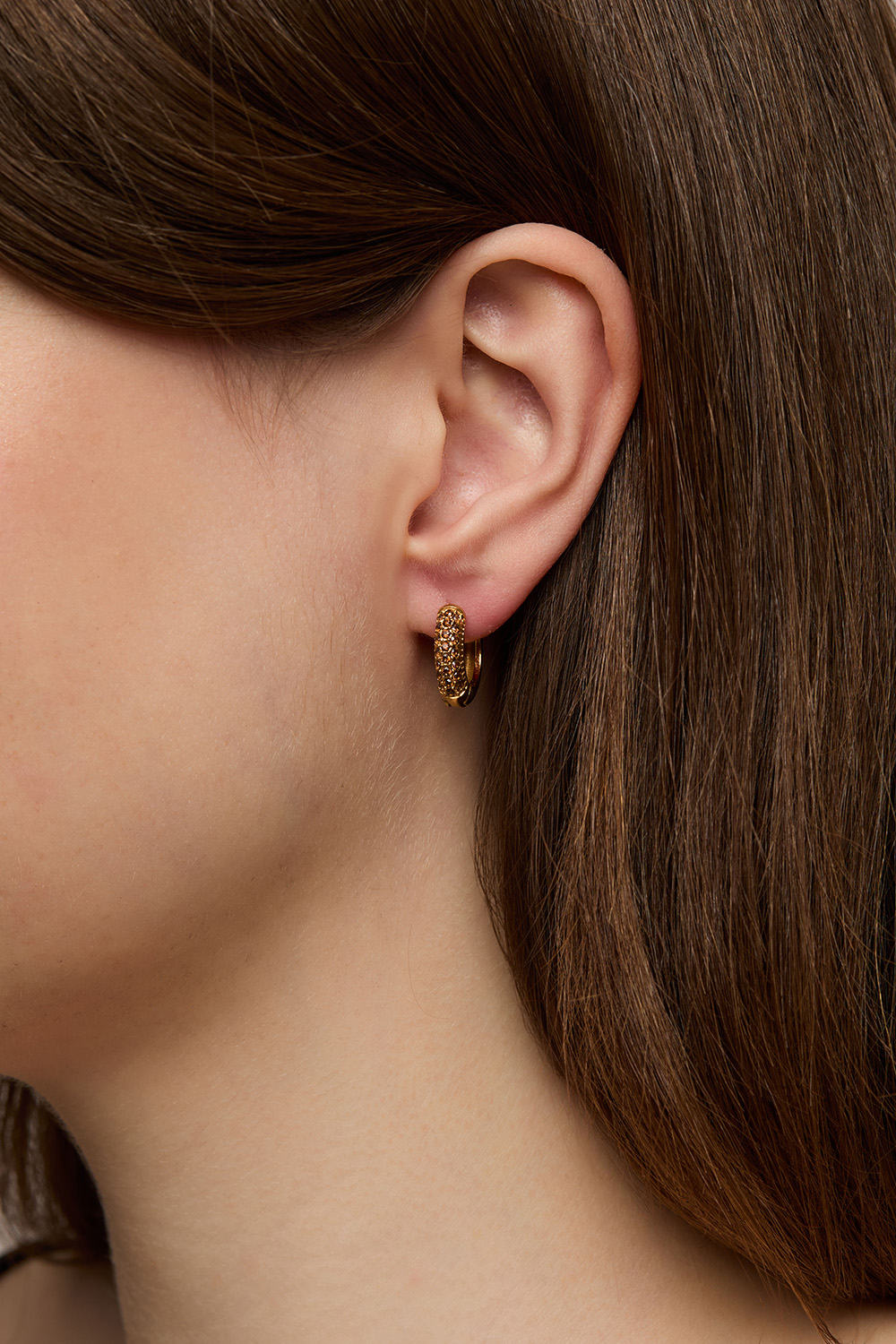 Små brede øredobber i høypolert rustfritt stål som er PVD-belagt med 18 k gull, og har tre rader med små, brune Cubic Zirconia-stener.