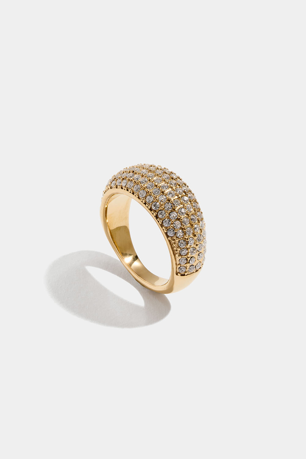 Bred ring i høyglanspolert rustfritt stål, PVD-belagt med 18 karat gull, og for det meste dekket av små Cubic Zirconia-steiner.