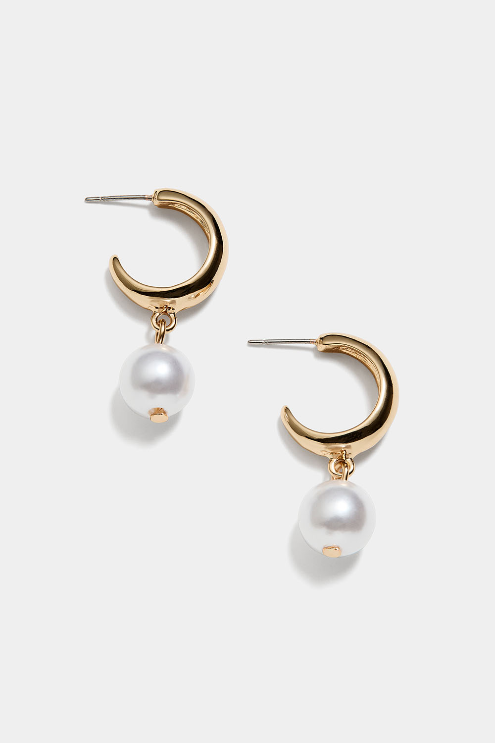Brede hoops i gullfarget metall med hvit, hengende perle.