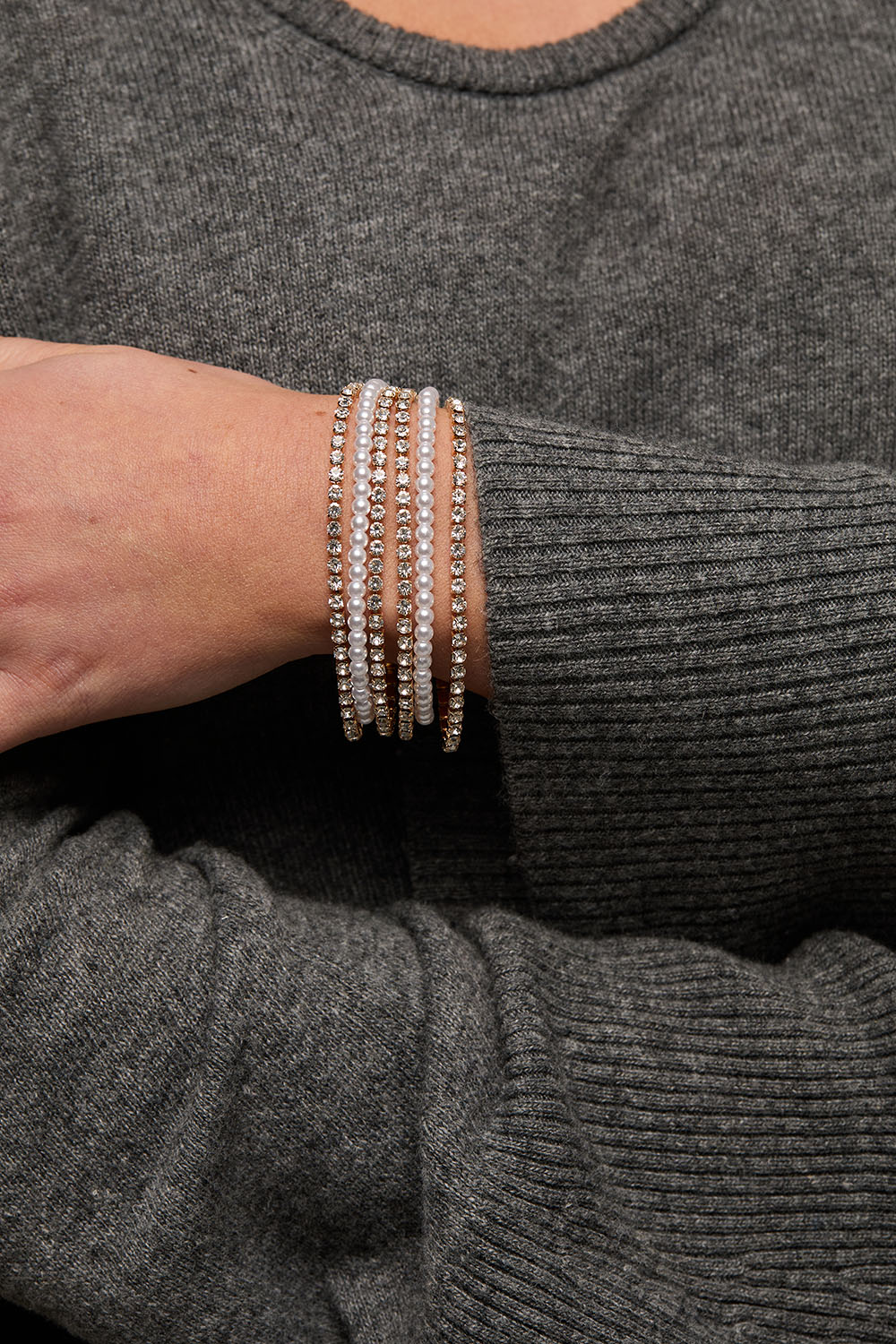 Bredt armbånd i gullfarget metall med strasslenker og hvite perler