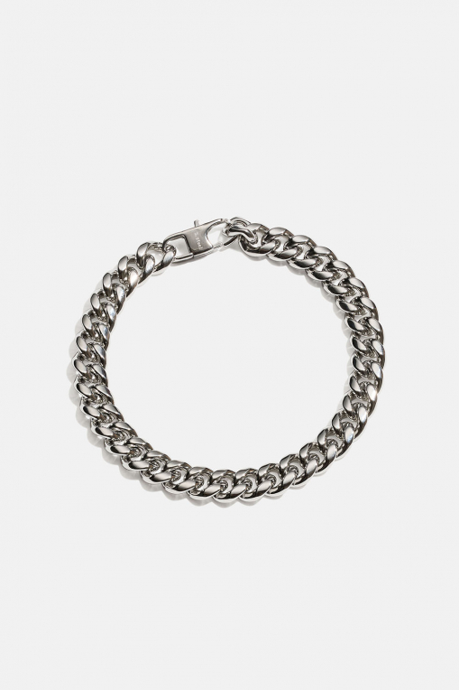 Bredt armbånd med panserkjede i rustfritt stål. Tidløse smykker laget av et vannavstøtende, allergivennlig og slitesterkt materiale som holder dem fine lenge. Bad, dusj og tren uten å bekymre deg for at de mister farge. Fås i størrelsene S/M og M/L.