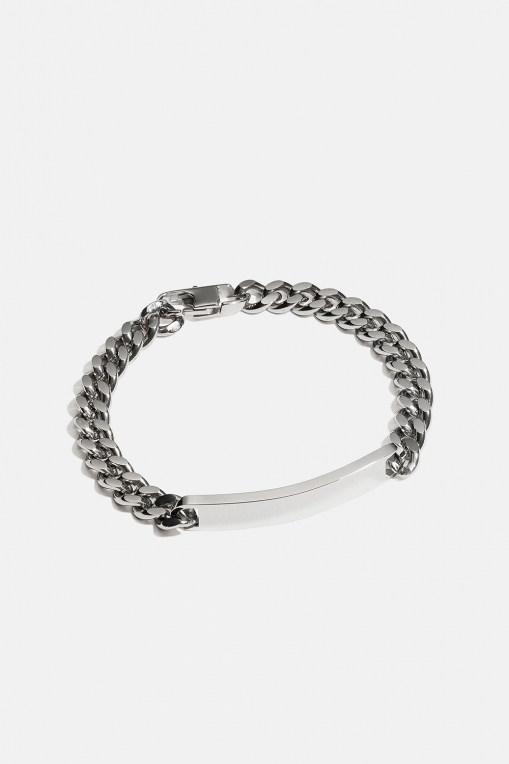 Bredt armbånd med panserkjede og plate i rustfritt stål. Tidløse smykker laget av et vannavstøtende, allergivennlig og slitesterkt materiale som holder dem fine lenge. Bad, dusj og tren uten å bekymre deg for at de mister farge. Fås i størrelsene S/M og M/L.