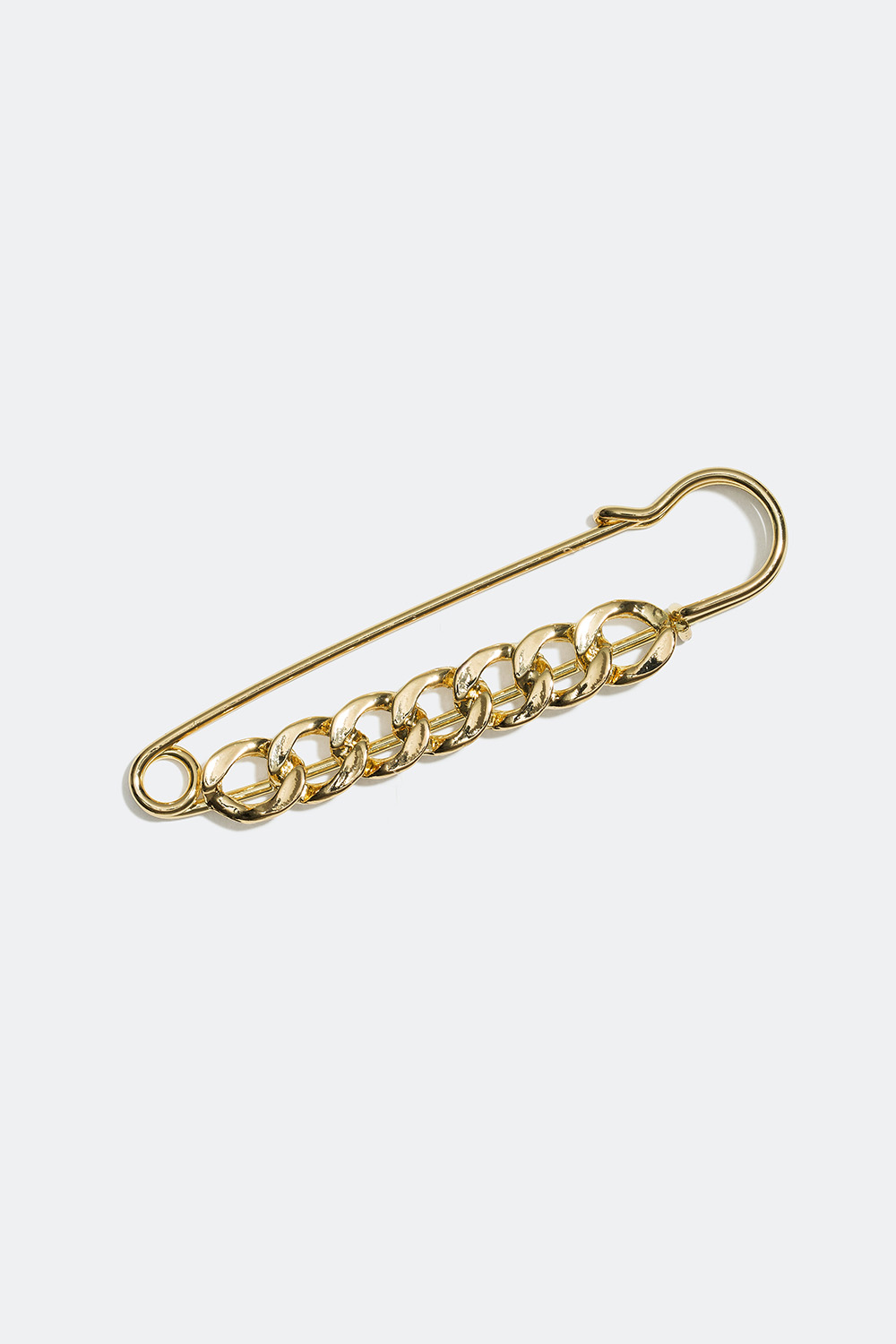 Brosje i metall, formet som en sikkerhetsnål som er dekorert med lenker. En stilsikker brosje som fungerer perfekt til å holde sammen en strikkejakke eller et sjal, men som også er fin som dekorasjon på andre plagg eller vesker.
