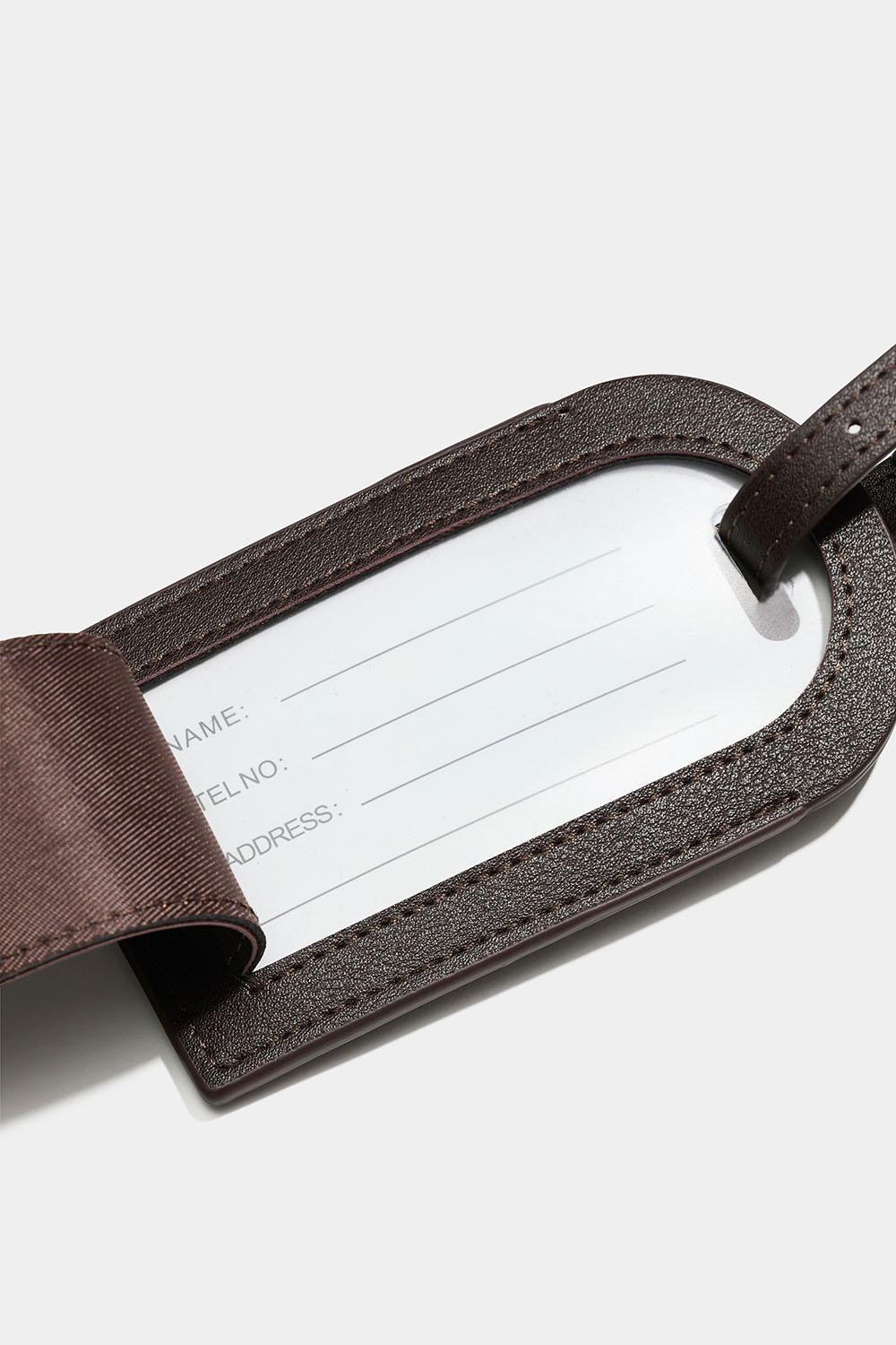 Brun bagasjelapp i imitert skinn som festes til bagasjen din. Inni kan du skrive personopplysninger på den medfølgende adresselappen.