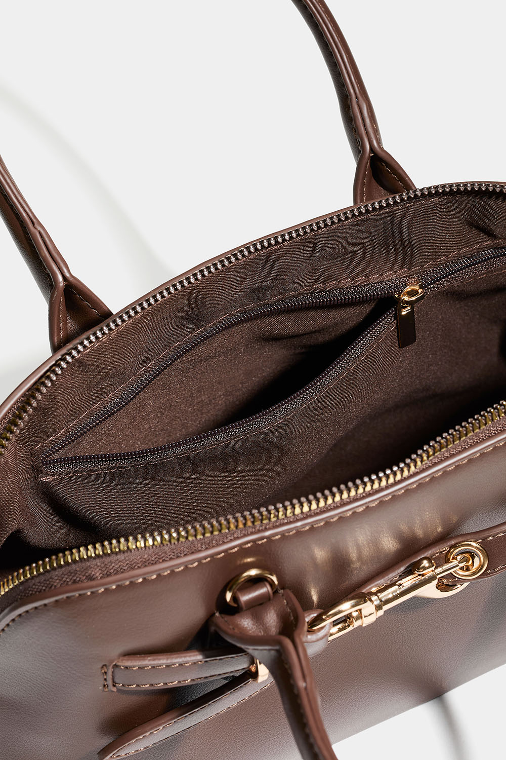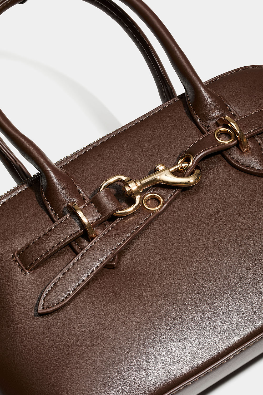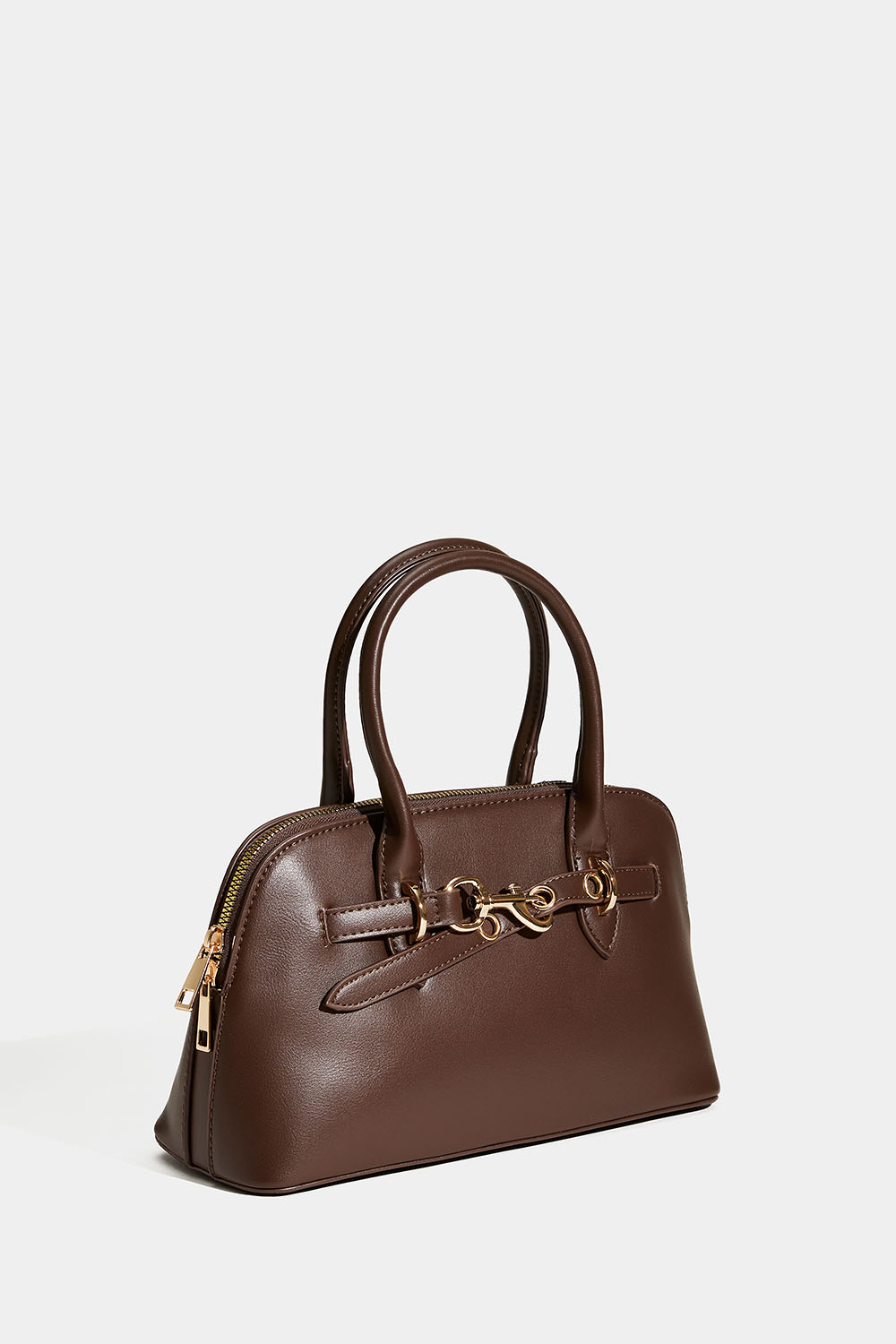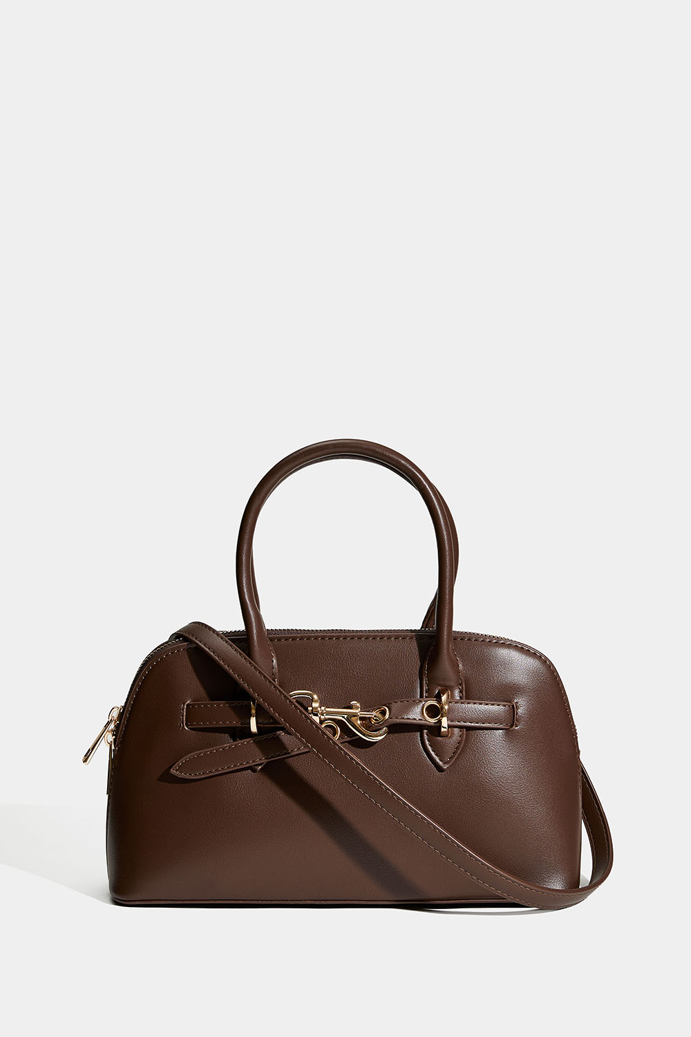 Brun håndveske med dobbelt håndtak. En stilren veske med rem og låsdetalj i gullfarget metall. Det store rommet lukkes med glidelås, og inni er det også et mindre rom. Kommer med avtakbar skulderrem.