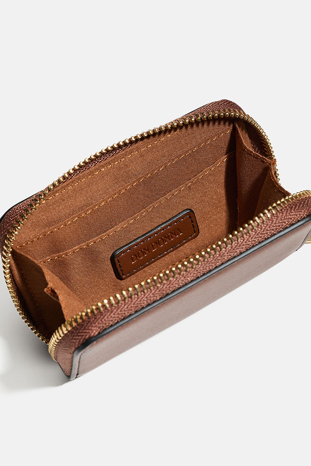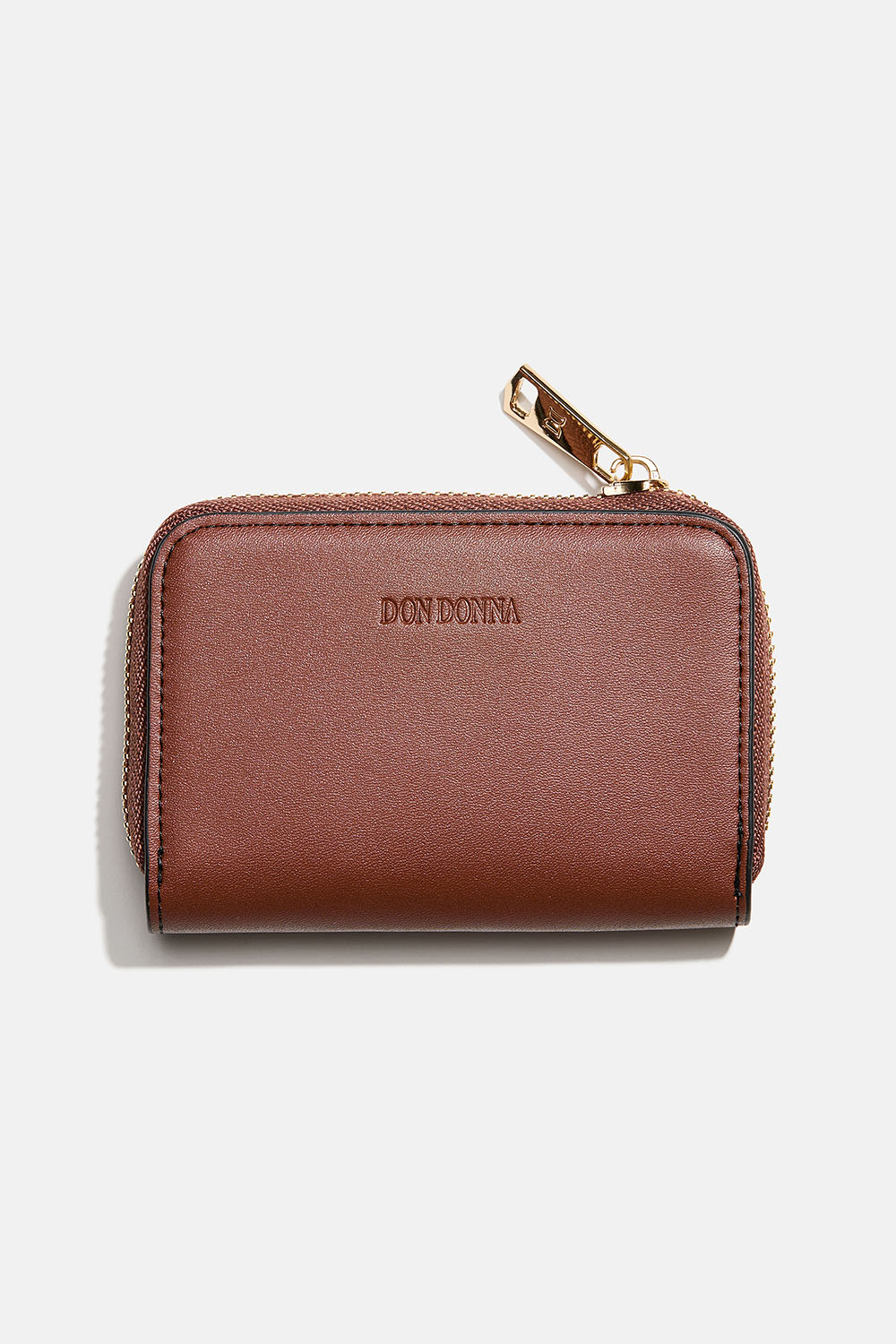 Lommebok i brunt imitert skinn til kort og sedler med Don Donna-logo preget på forsiden. Praktisk liten lommebok med små rom til kort. Lommeboken lukkes med en glidelås, som holder kortene dine trygt på plass. Stilren lommebok som matcher Don Donna-veskene våre perfekt.