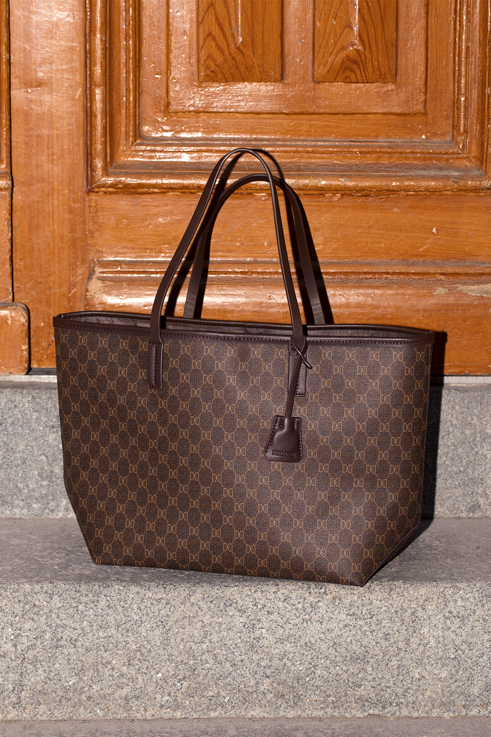 Stort brunmønstret tote veske med en trykt Don Donna-logo. En stilren veske med smale håndtak, som kombinerer mote med funksjon. Den har en nøkkelring, ett stort rom og to små rom på innsiden. Perfekt hverdagsveske til jobb og skole, med god plass og smart oppbevaring.