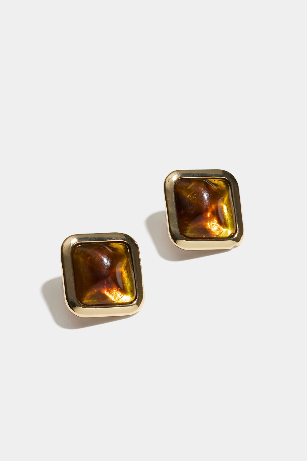 Kvadratiske øreringer i brunskiftende ravimitasjon med gullfarget metallinnfatning.