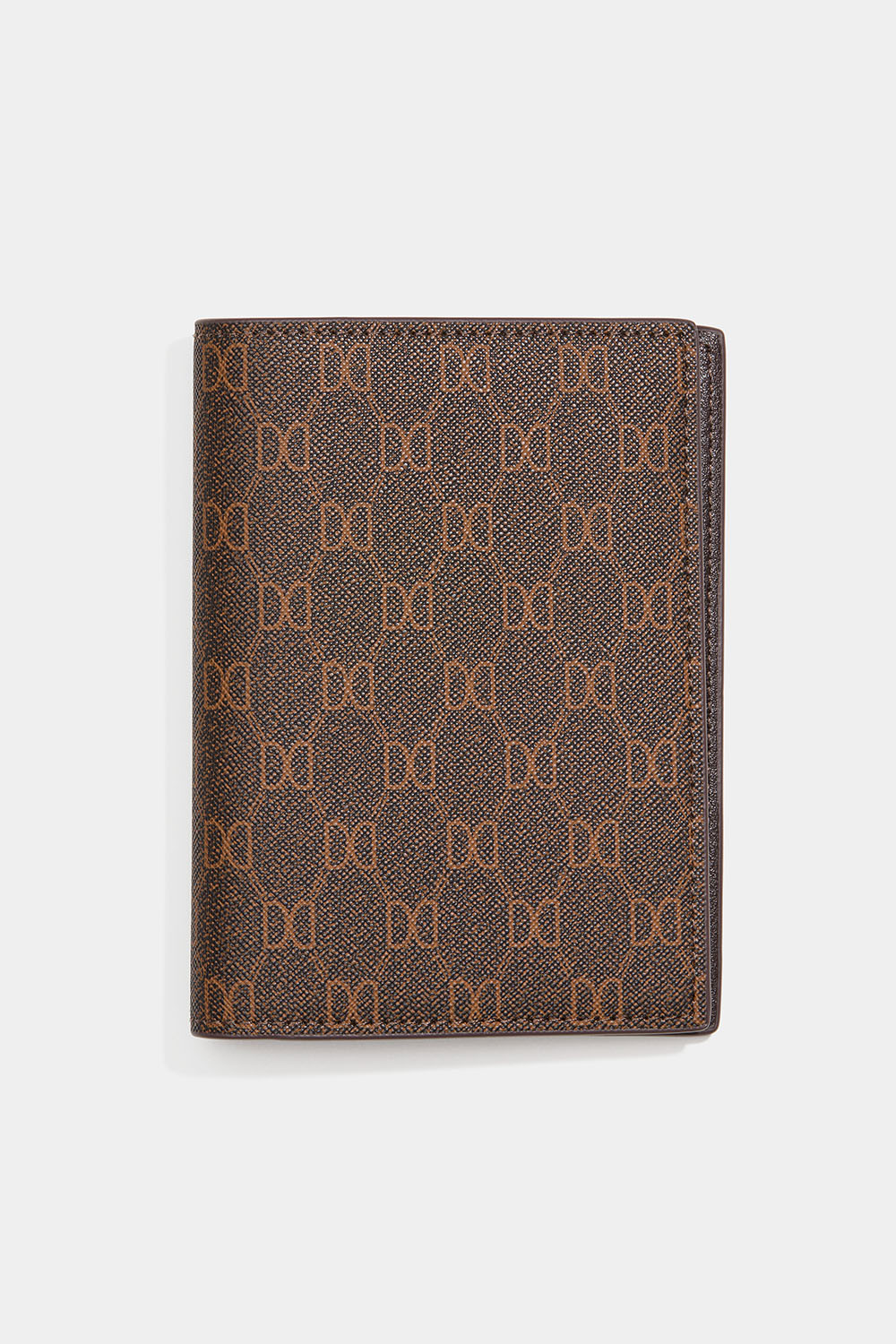 Brunt passetui med DD mønster imitert skinn. Innvendig er det også fire rom for kort.