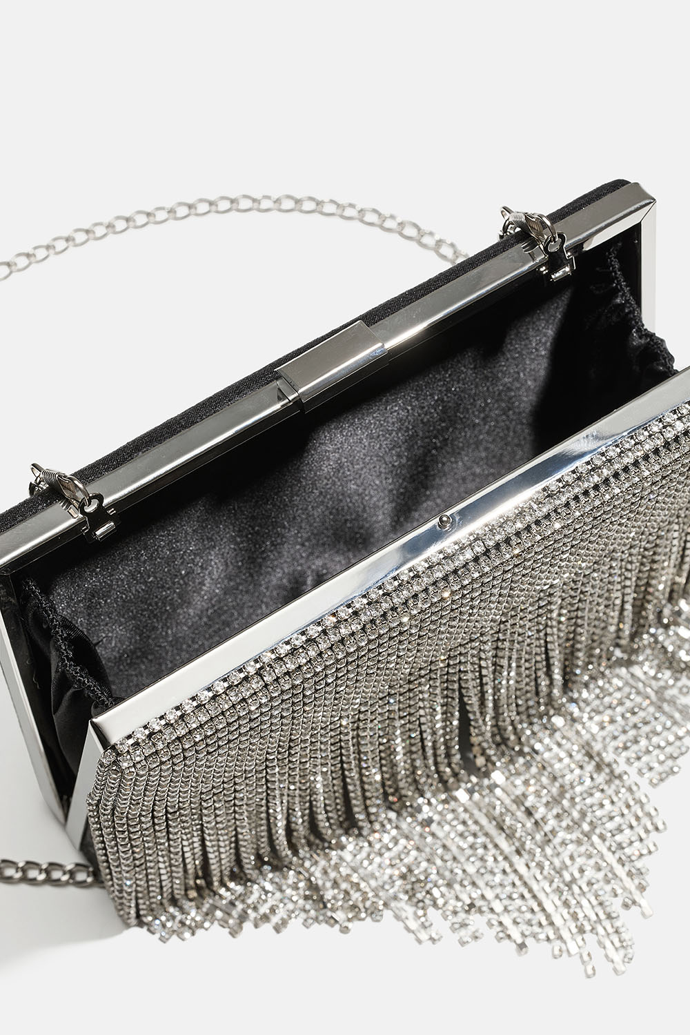 Hard clutch i svart stoff med hengende strasslenker. Vesken åpnes med en spenne, og det følger med en avtagbar kjederem.