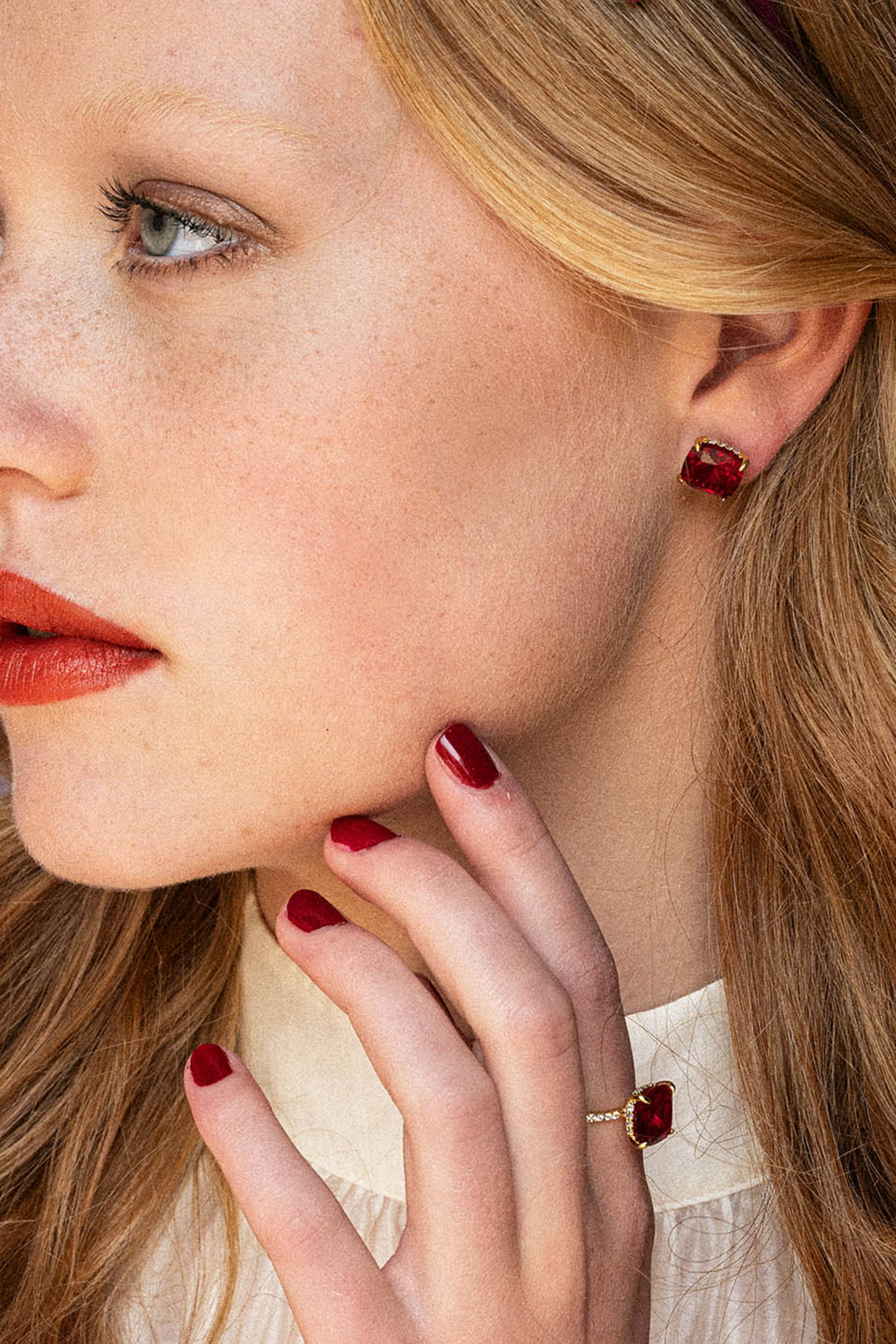 Våre Desiree stiftøredobber har en strålende firkantet, granatrød cubic zirkonia som gløder med varm eleganse. Disse øredobbene har en elegant og tidløs design og er perfekt for å gi hverdagsantrekket et løft og aftenantrekket et snev av raffinert glamour. Kombiner dem med Desiree-ringen for en perfekt komponert look.