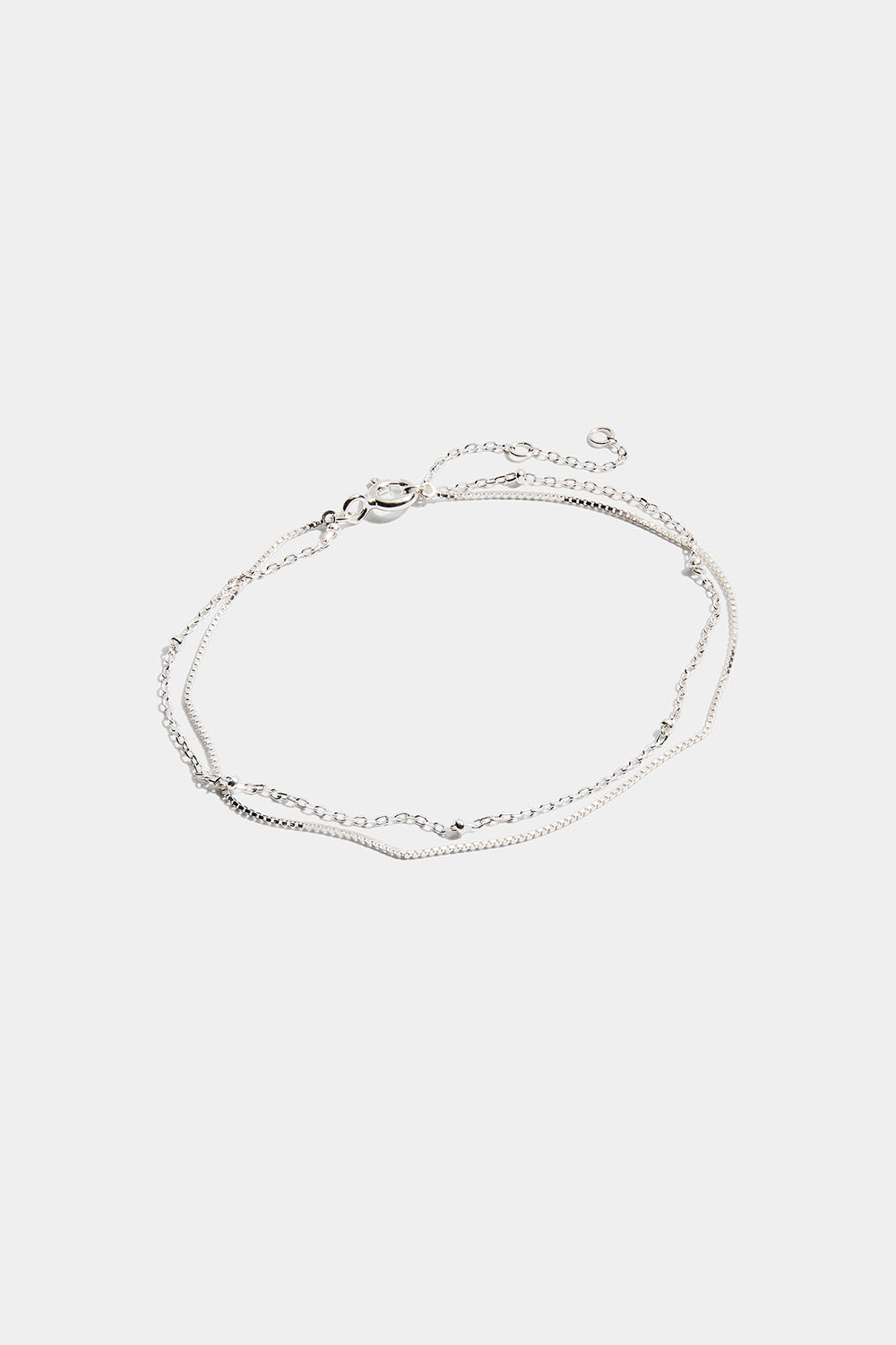 Tynt, dobbelt armbånd i ekte sølv med to kjeder. Et kompakt, kantede kjede og ett med små sølvkuler.