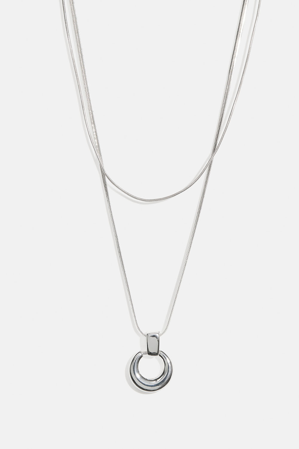 Dobbelt halskjede i to lengder med kompakt metallkjede og rundt anheng.