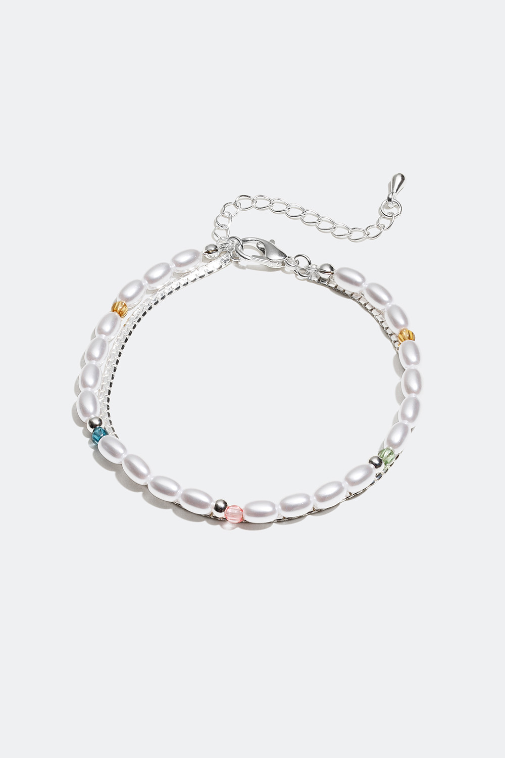 Dobbeltarmbånd med to lenker som er festet i samme spenne. Det ene armbåndet er dekorert med hvite, ovale perler og små runde perler i metall og pastellfarger. Det andre armbåndet er en enkel lenke med flat design. Et armbånd med sommerfølelse som passer perfekt til både kjole og bluse.