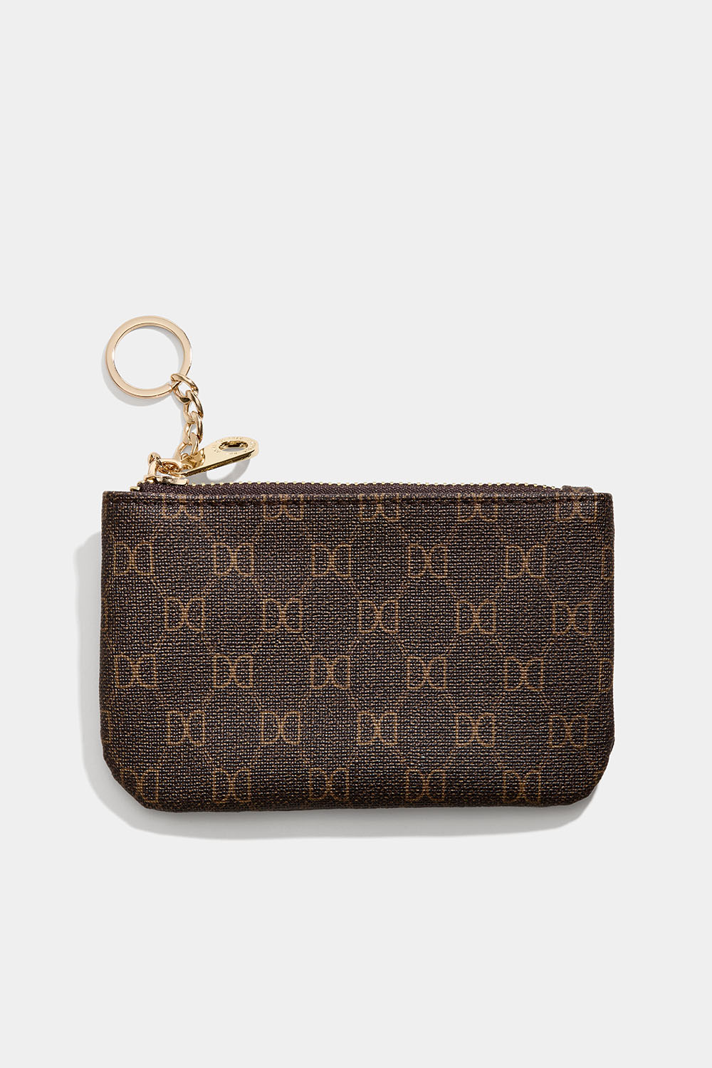Lommebok/pengepung i Don Donnas signaturmønster i brunt, med gullfargede detaljer og lenke med nøkkelring. Lommeboken lukkes med en glidelås og har to rom inni.