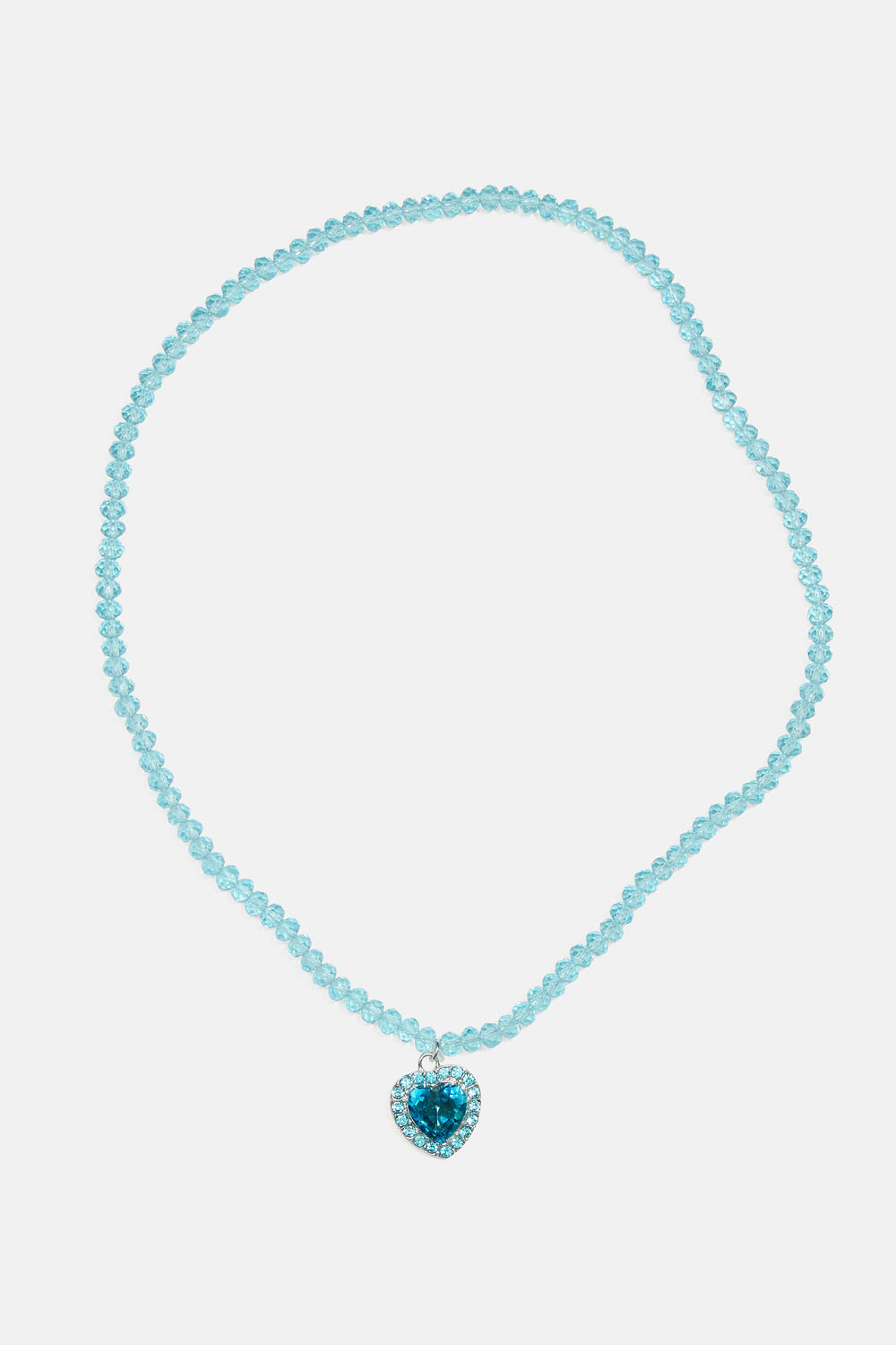 Elastisk halskjede til barn med blå glassperler og et hjerteanheng i metall dekorert med glasstener.