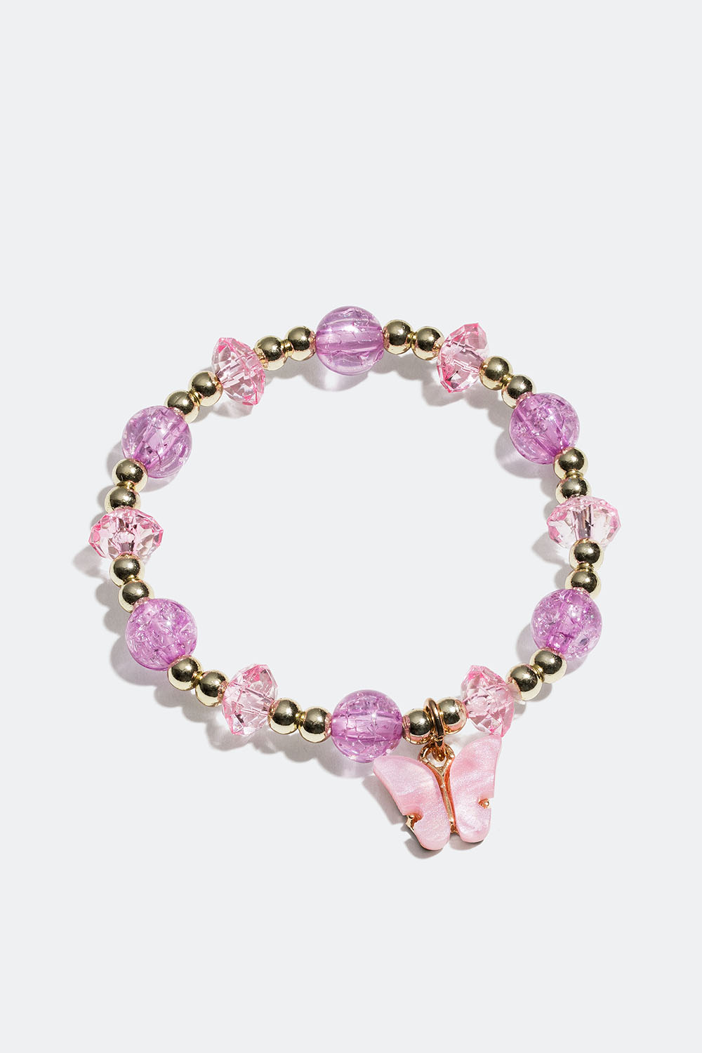 Elastisk armbånd med rosa og lilla perler og sommerfuglanheng i rosa.
