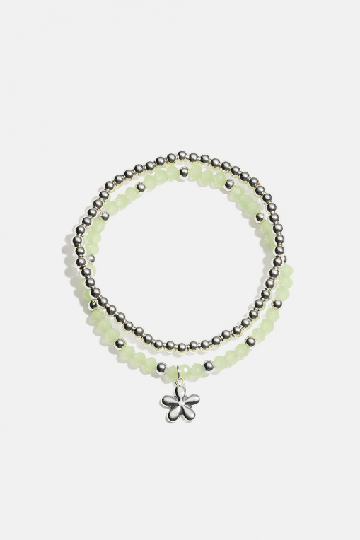 Elastiske armbånd med blomst og grønne og sølvfargede perler, 2-pakning i gruppen Smykker / Armbånd / Flerpakning hos Glitter (251001981001)