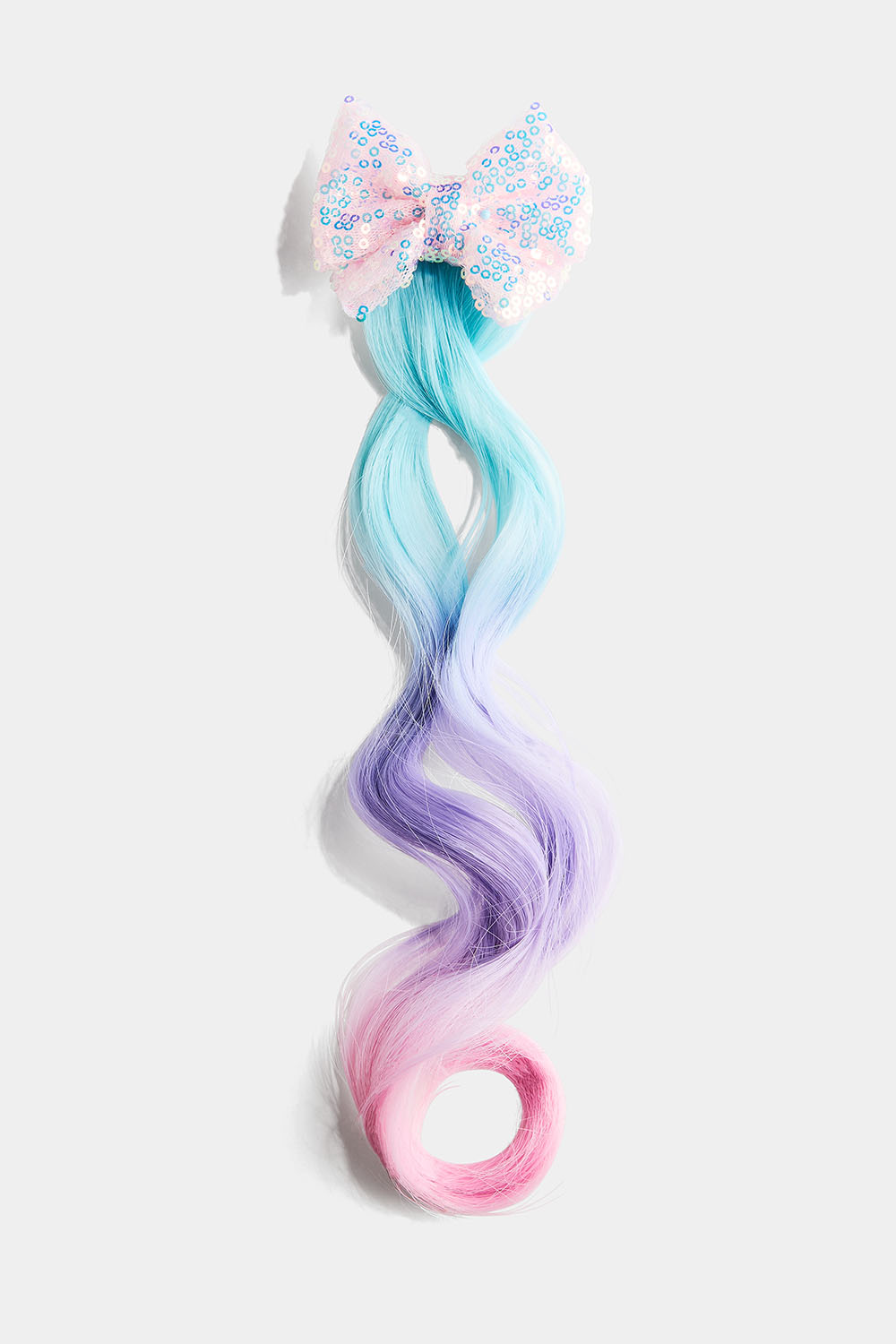 Syntetisk løshår i rosa, lilla og blått på en rosa sløyfeklemme dekket av paljetter.