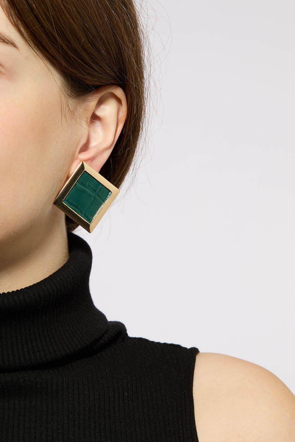 Store firkantede øredobber i gullfarget metall og grønn slangeskinnsimitasjon