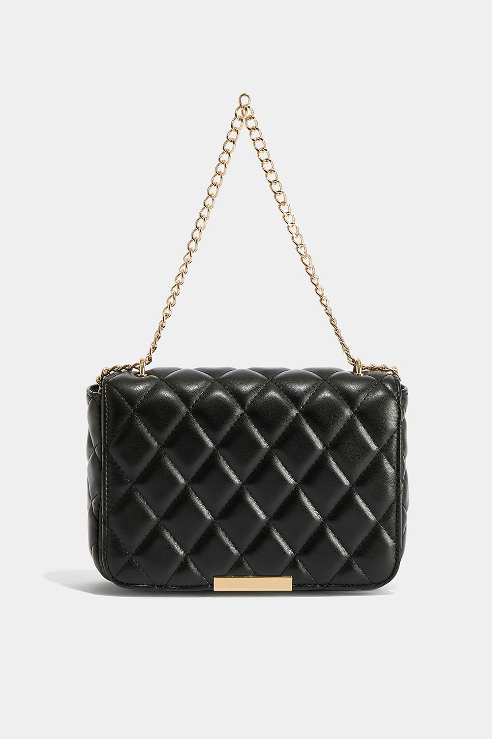 En svart, firkantet veske i quiltet kunstskinn med gullfarget dobbeltlenke. Med lenken som er lengst, kan vesken bæres crossbody. Vesken lukkes med en magnetknapp og har en liten innerlomme som lukkes med glidelås. En liten, klassisk modell som passer både til dag- og kveldsbruk.