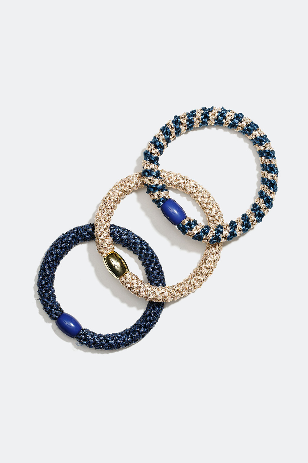 3-pakning med kraftige hårstrikk i blå og gullfargede toner, med en perledetalj i matchende farge. Disse strikkene er flettet sammen av mindre strikker, noe som gjør dem ekstra elastiske og svært skånsomme mot håret. Når du ikke bruker dem i håret, er de fine å ha rundt håndleddet.
