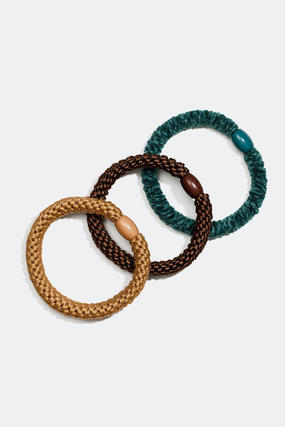 3 pakning med solide hårstrikker i jordnære farger, og en perledetalj i matchende farge. Disse hårstrikkene er flettet sammen av mindre strikker, og er ekstra elastiske og svært skånsomme mot håret. Når du ikke bruker dem i håret, er de fine å ha rundt håndleddet.