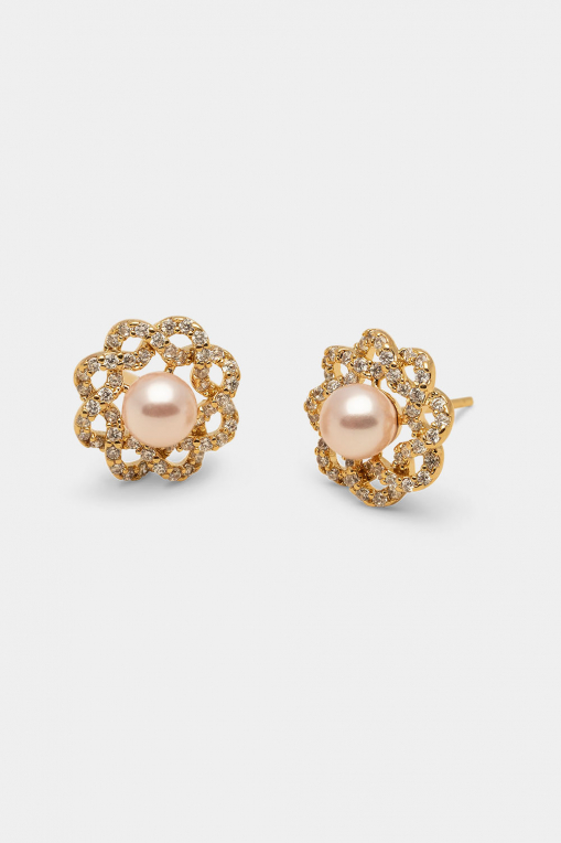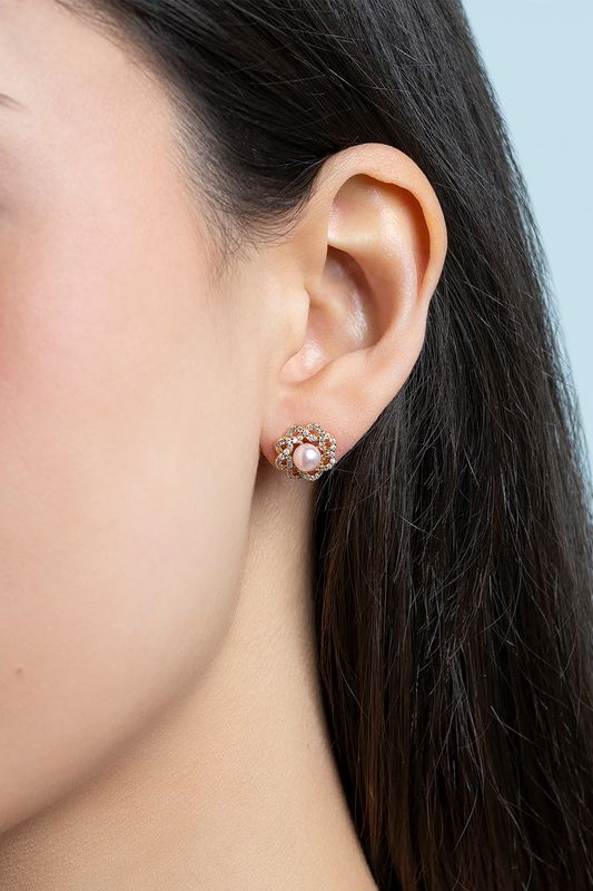 Våre Fleur-øredobber har en strålende rosefarget perle i midten, innrammet av delikate bladdetaljer dekorert med små klare steiner. Et tidløst og elegant design, perfekt for både hverdag og fest.