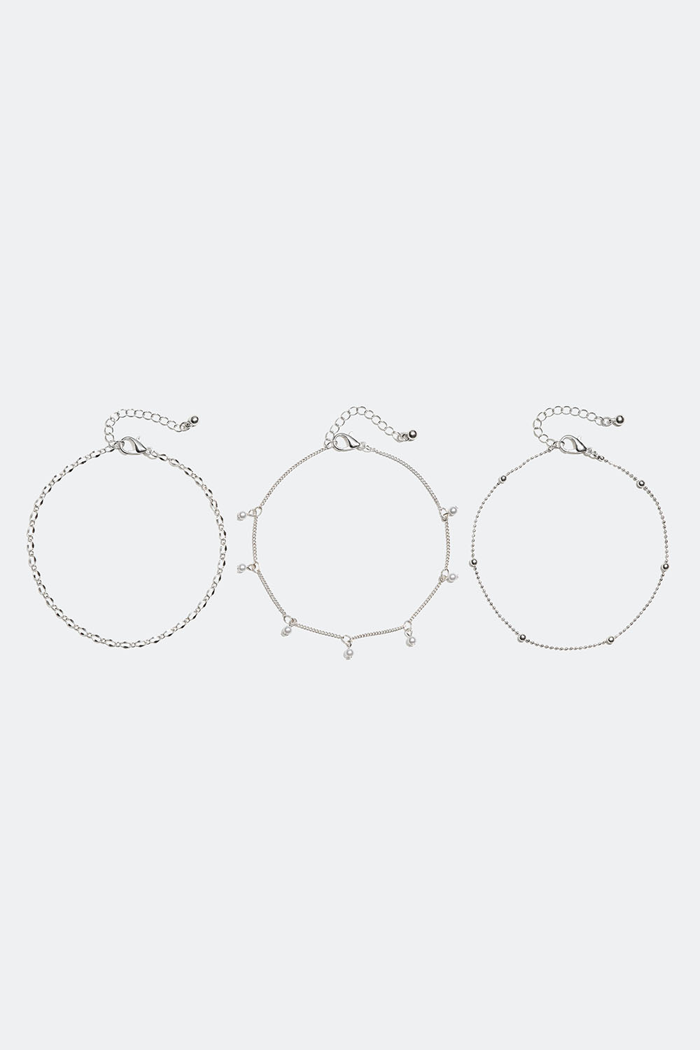 3-pakning med fotlenker. En med hvite perler, den andre har metallkuler og den tredje har en hamret design.