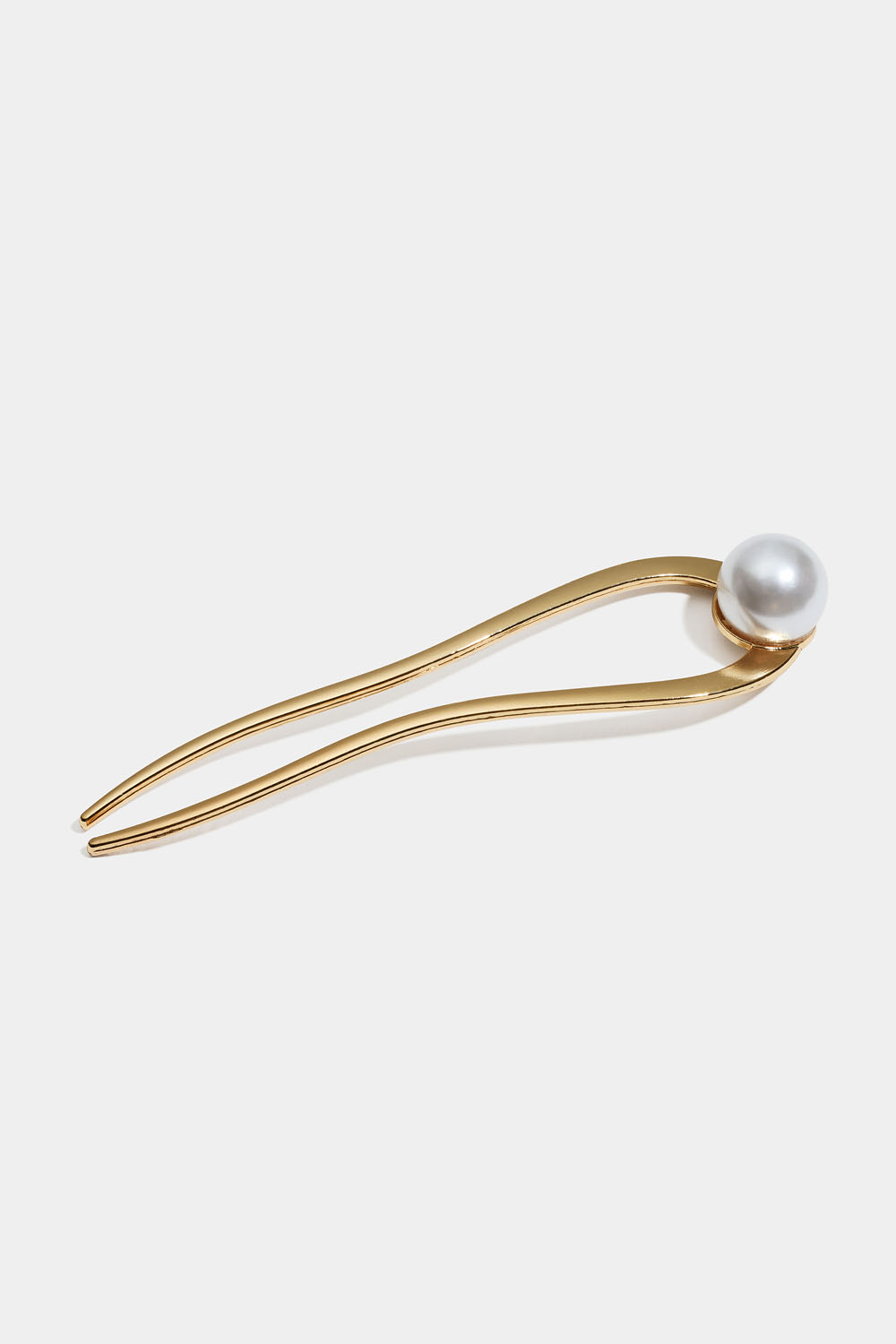 Fransk hårnål i gullfarget metall dekorert med en stor hvit perle.