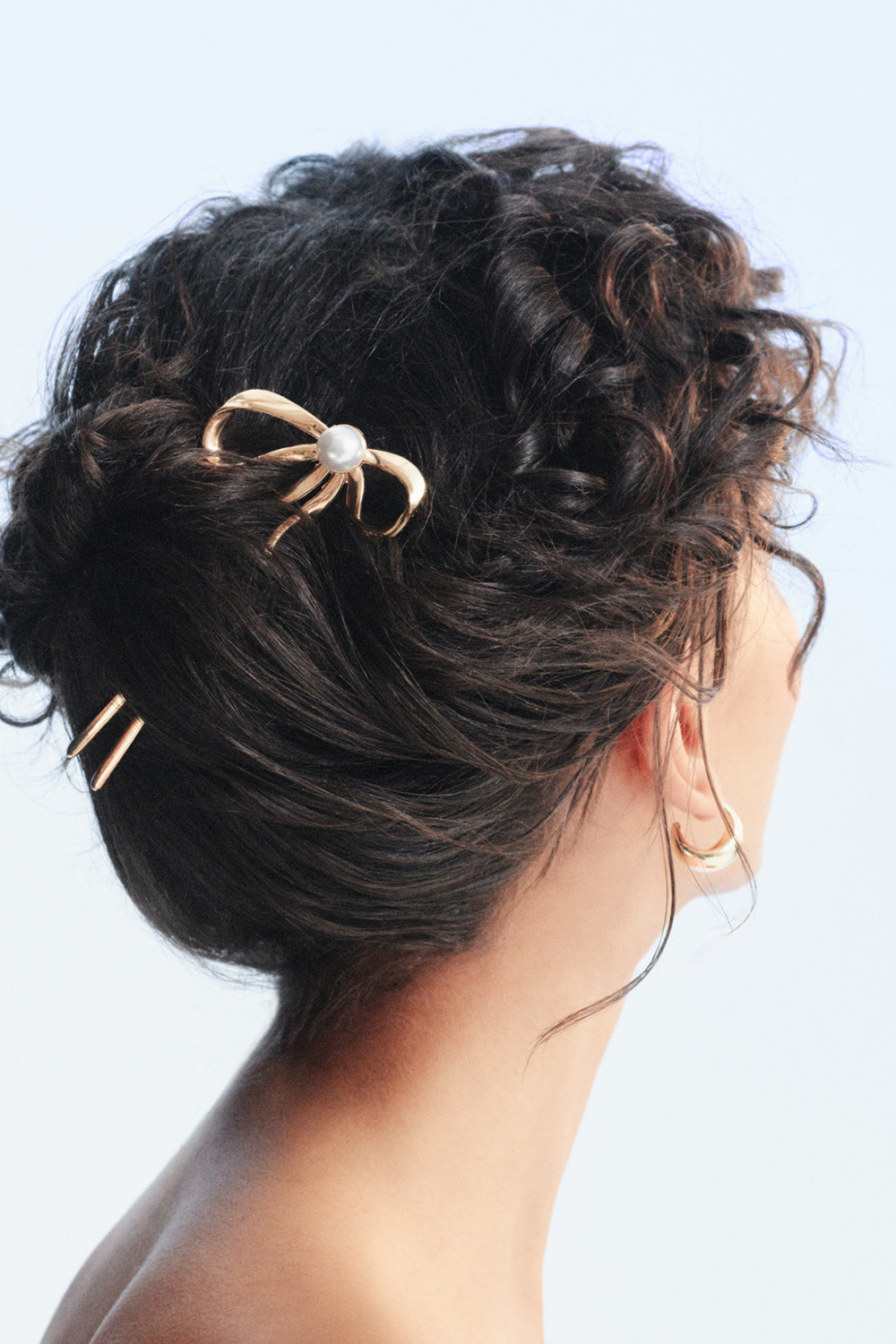 Stor hårnål i gullfarget metall i sløyfeform dekorert med en hvit perle. Kan brukes til å sette opp håret, eller for å piffe opp en håroppsats.